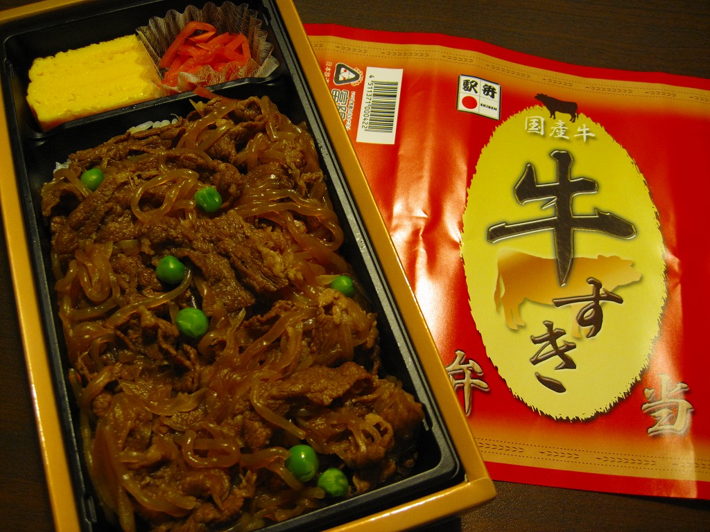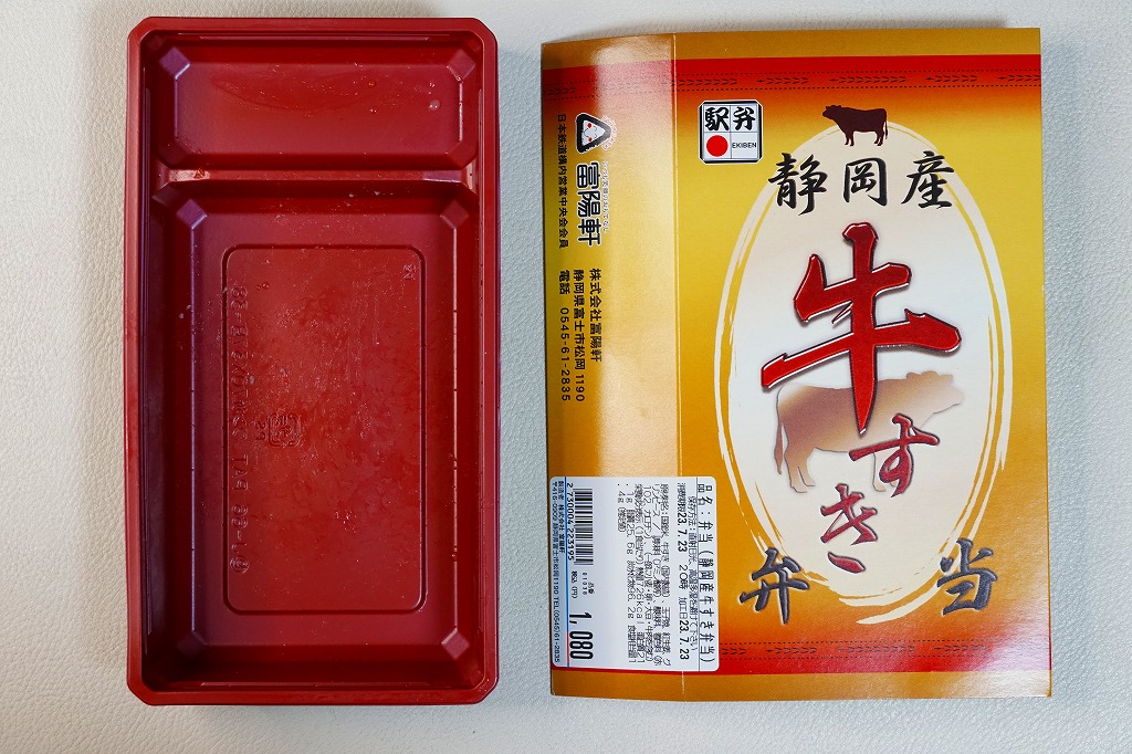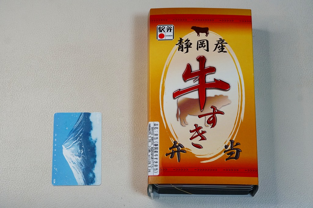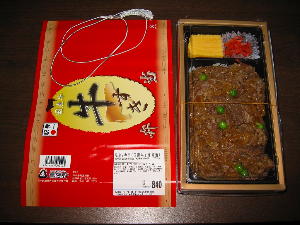 2009(平成21)年に発売か。新富士駅でのみ販売される駅弁だそうな。ボール紙を組み立てた長方形の容器に透明なふたをして、商品名を書いた赤い掛紙で巻く。黒いプラ製トレーに収まる中身は、白御飯の上を牛肉、タマネギ、糸こんにゃくとグリーンピースで覆い、玉子焼と紅生姜を添える牛丼。国産牛と書かれるメインの牛肉が、駅弁としても惣菜としてもずいぶん固めな感じ。しかし飯も肉もたっぷり入っている。価格は2010年の購入時で840円、2014年時点で900円。2019年5月に上記の「静岡産牛すき弁当」へリニューアル。
