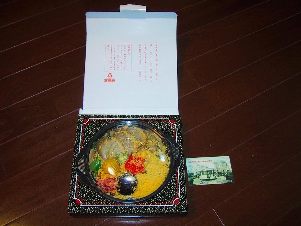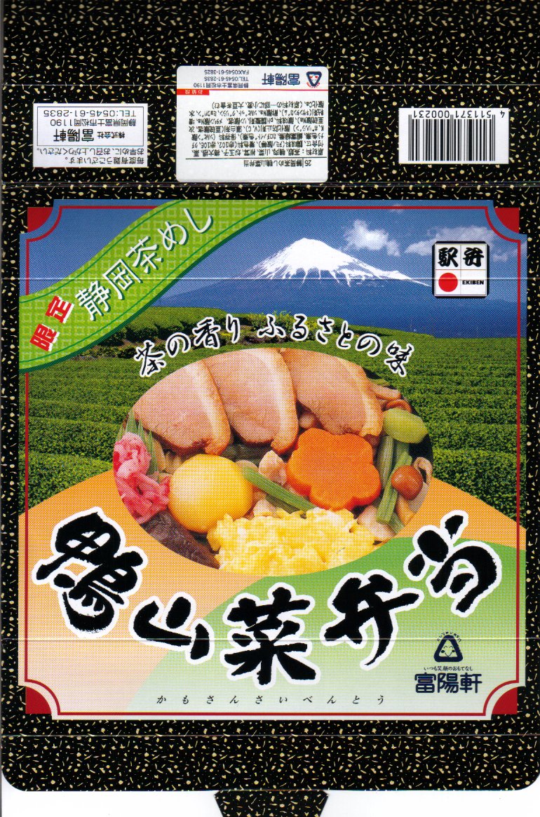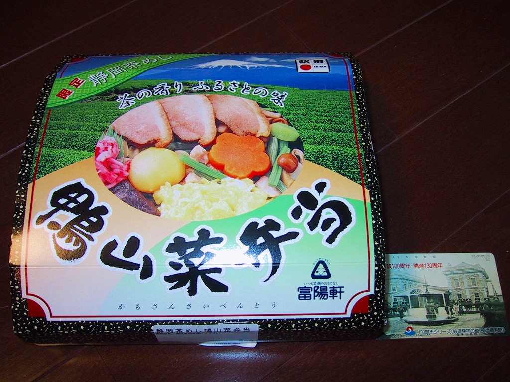 2002(平成14)年10月に発売。大きなボール紙の箱に、丸くて黒いプラ製のトレーをはめる。中身は静岡茶で炊いたお茶飯の上に、合鴨ロース、きのこに山菜、人参や椎茸の煮物、煎り卵などと栗を載せたもの。駅弁にしては量が多い鴨肉はさっぱりして、見た目の乱雑さと異なり味は上品な気がした。山菜には珍しいものも入っているとか。現在は販売されていない模様。