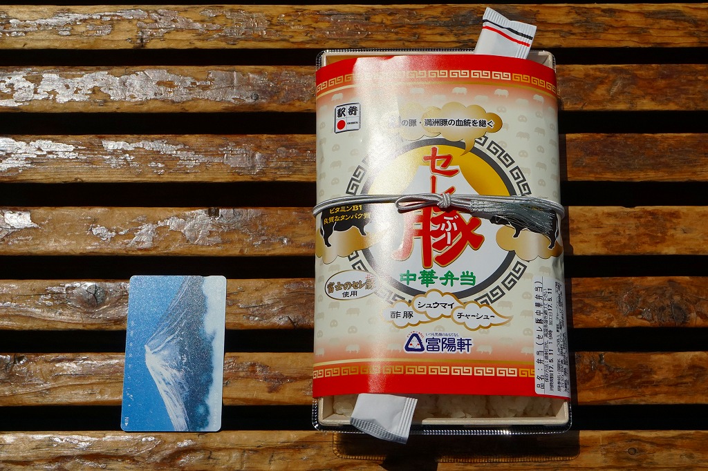 2017(平成29)年5月1日の発売。日の丸俵飯に、「富士のセレ豚(ぶー)」の豚肉を使うという焼売2個、酢豚、チャーシュー2枚、そして玉子焼とタケノコを添える。見た目は古風な幕の内駅弁で、中身は豚肉弁当で、雰囲気は中華風幕の内弁当。偶然か必然か、そんなカテゴリの大先輩格である横浜駅のシウマイ弁当に似ているような、そうでもないような。富士のセレ豚とは、静岡県富士宮市の畜産業者の商品で、中国大陸在来の満州豚を基礎に育成・開発されたそうな。2019年4月限りで終売。