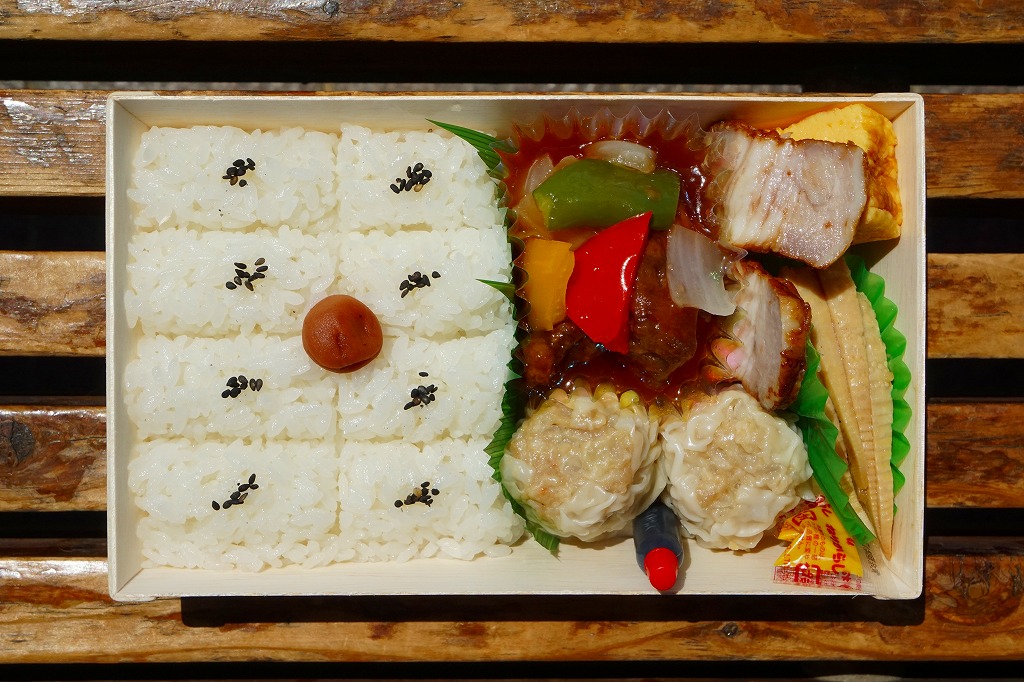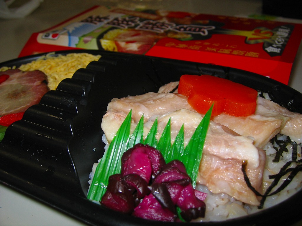 2000(平成12)年に発売。立体的なふたがユニークな正方形の大きなボール紙製組立パッケージの中に、円形の容器をはめ込む。中身は中華おこわの上に金華豚の焼豚を三切れ載せ、ザーサイや錦糸卵を添えた、中華風弁当。デザートにはライチが入っていた。焼豚はジューシーというかクリーミーというか、臭みがまったくない上にサクッとした歯ごたえと溶けるような食感が両立した、豚肉のイメージを覆すグルメなもので、この内容で880円はお買い得と感じる。現在は販売されていない模様。