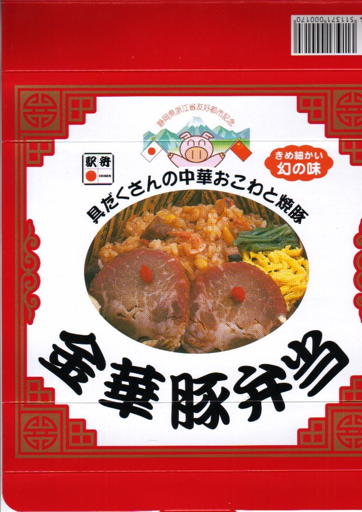 金華豚(きんかとん)とは、中国浙江省金華地区を中心に飼育されている高級肉豚で、塩漬けのハムが世界三大ハムのひとつに数えられている。静岡県と浙江省が有効姉妹都市であることから1986(昭和61)年に御殿場市での飼育が始まったとか。御殿場市が日本唯一の産地で、5戸の農家と1軒の精肉店のみが取り扱うため、幻の豚と呼ぶマスコミもある。なぜか御殿場や三島・沼津でなく、富士で駅弁となった。