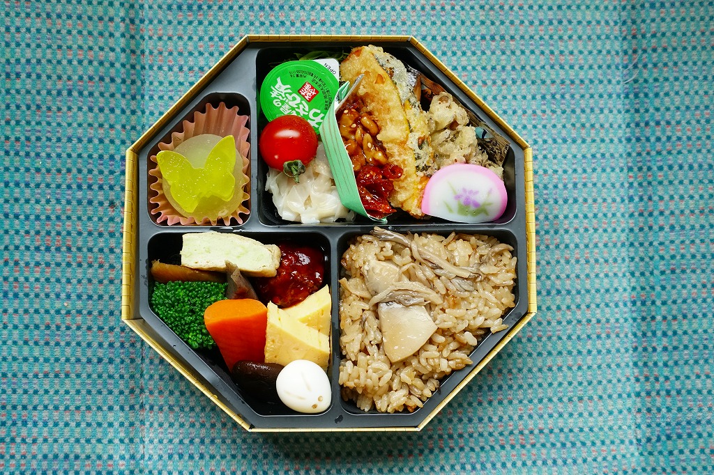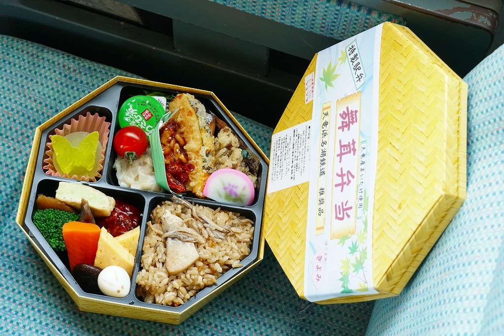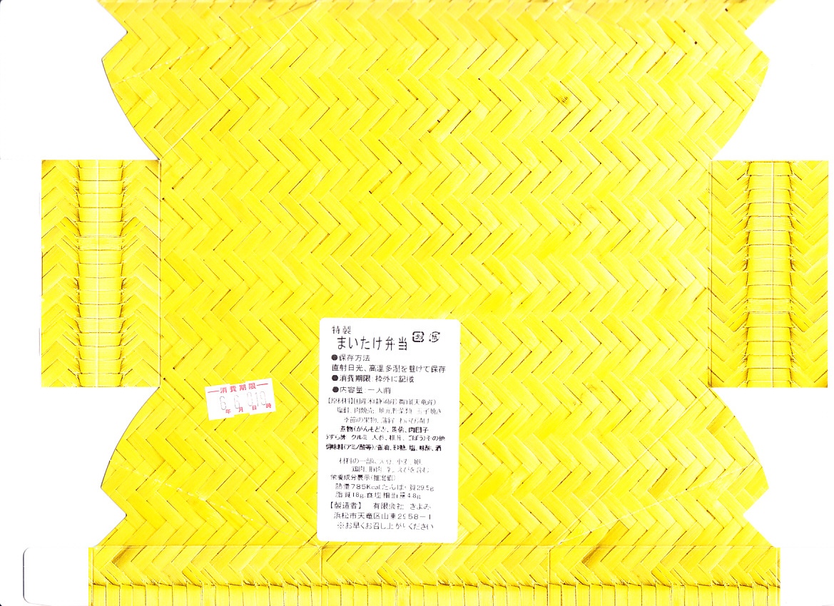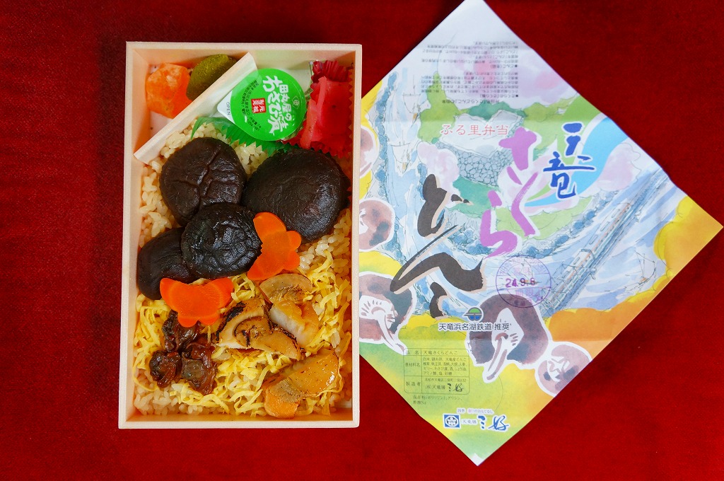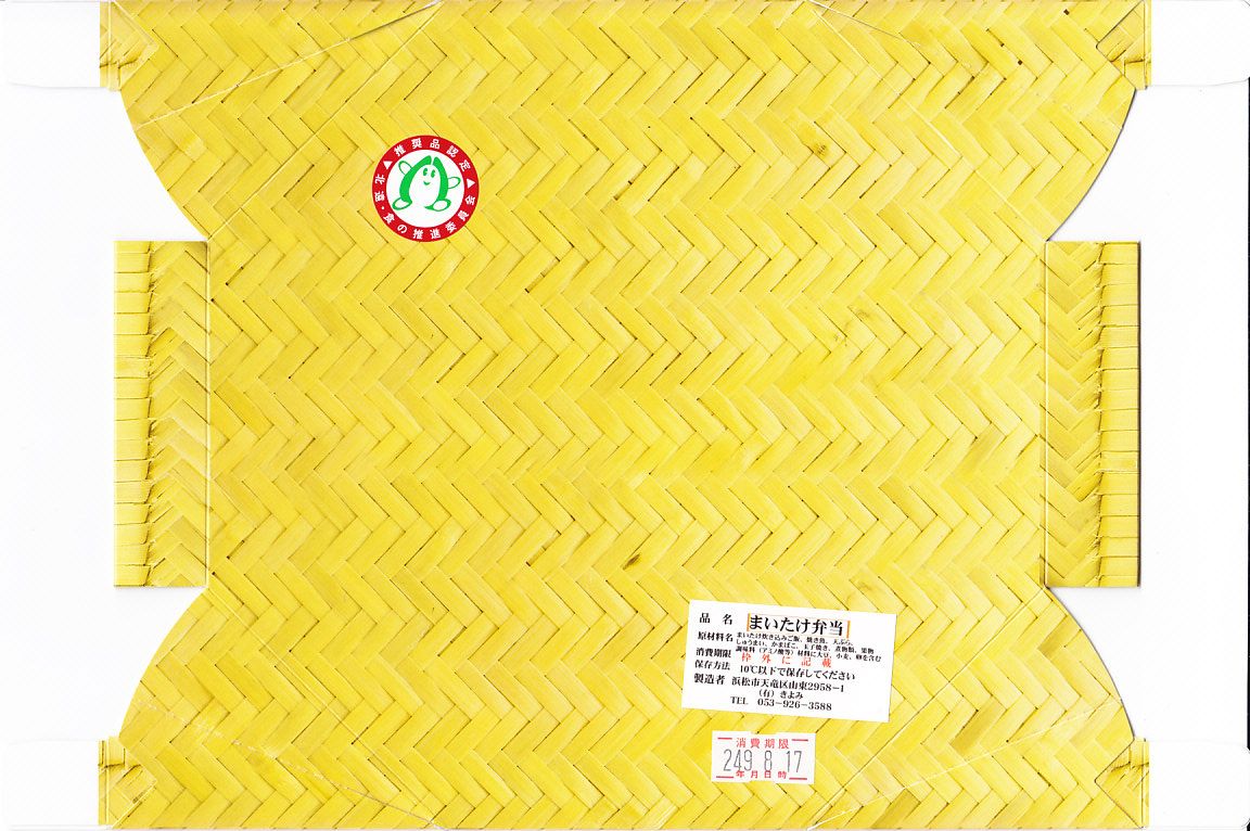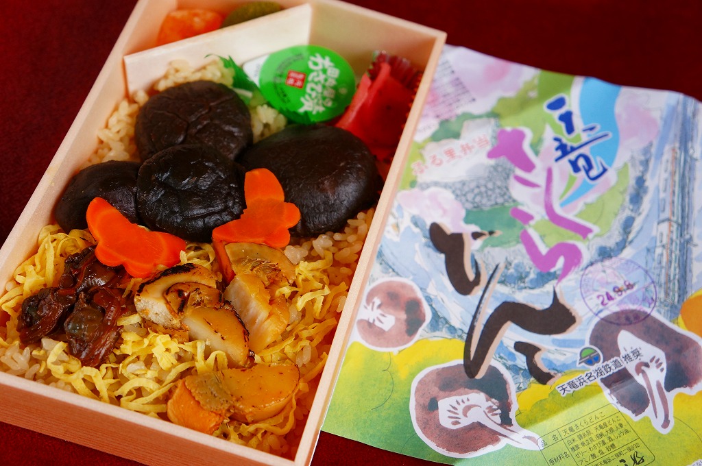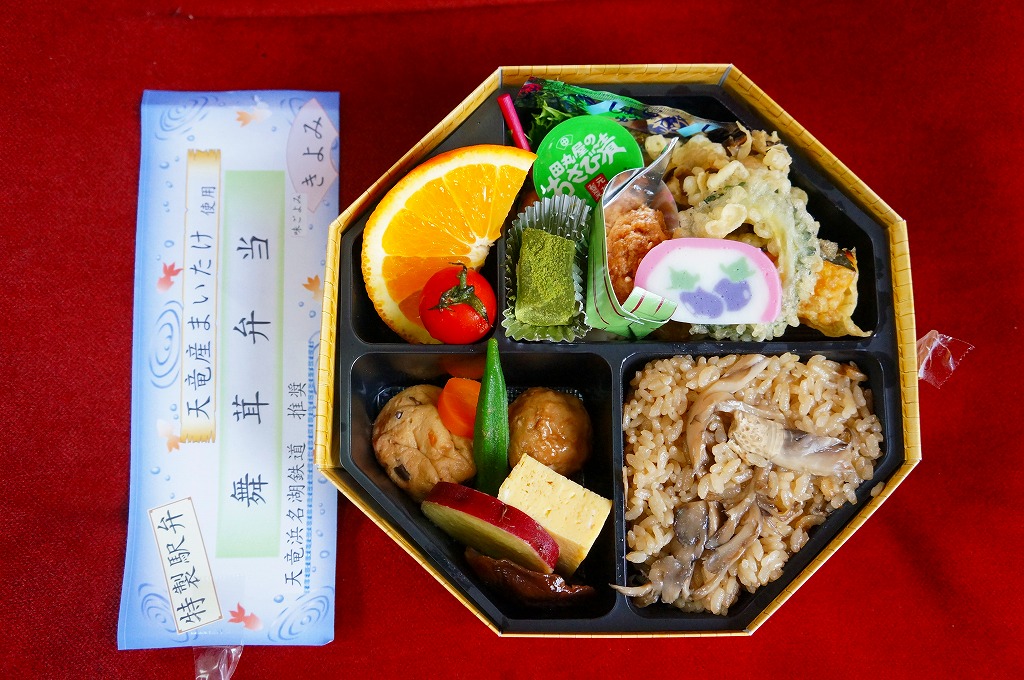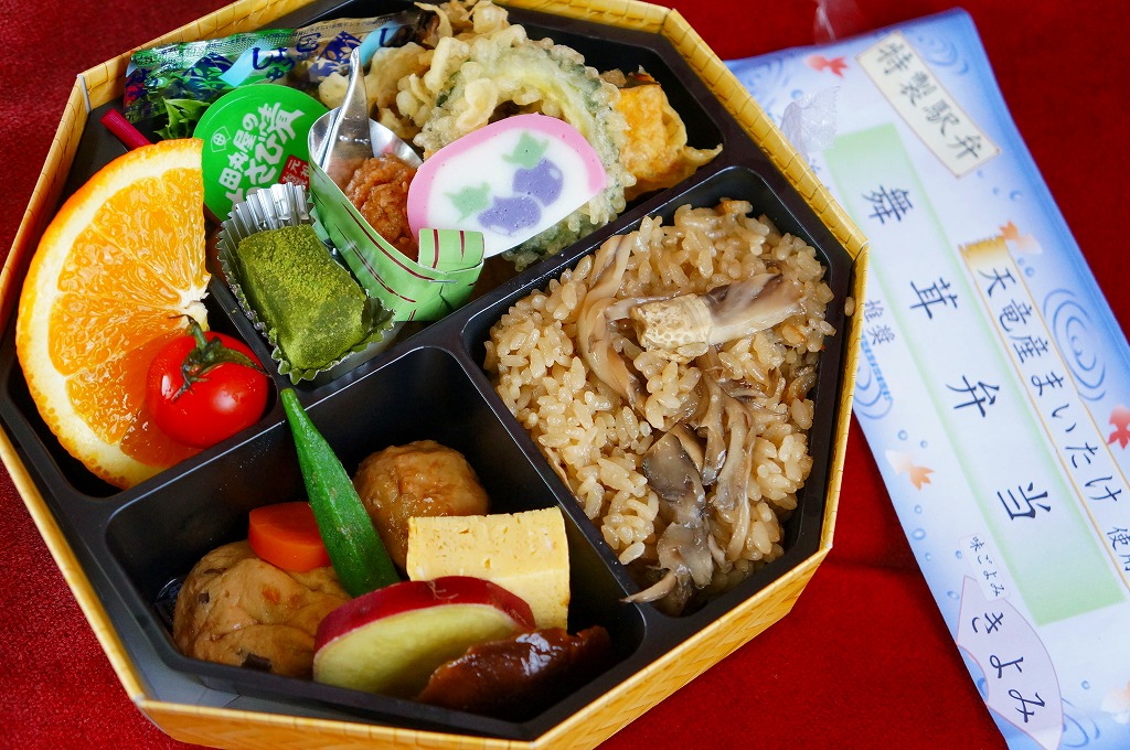 2009(平成21)年の秋に発売。2010年代には土休日に一日10個の販売と紹介され、その後は土休日の販売で、平日は4個以上の予約販売。竹皮編みの柄をした、正八角形のボール紙製容器に、商品名などを書いた掛紙を巻く。黒いプラ製トレーの中身は、天竜産というマイタケの炊込飯、煮物類、天ぷら、肉団子、焼き魚、オレンジなど。御飯以外の中身は一定しないらしい。知名度も内容も風味も地味だけれども、とてもていねいに作られている感じがした。
