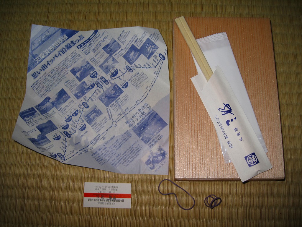 上記の駅弁「舞茸弁当」の、2012(平成24)年時点での姿。おおむね同じ姿が維持されているといってよいだろう。この駅で駅弁を買ったという話はあまり聞かれなくても、ローカル線の駅で10年以上も駅弁の販売が続けられていることは、とてもすごいことだと思う。