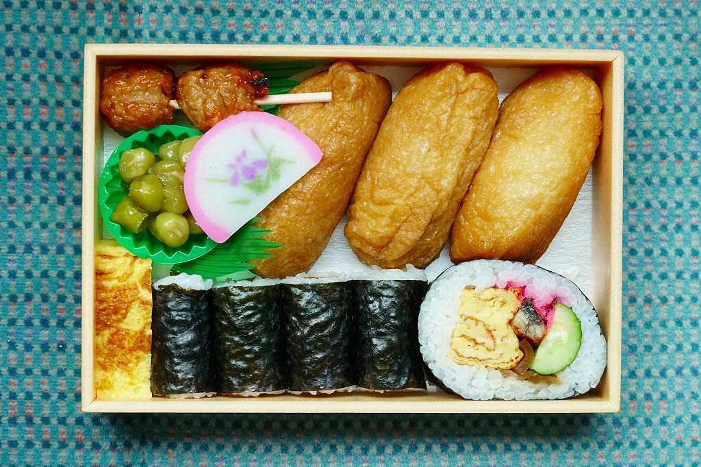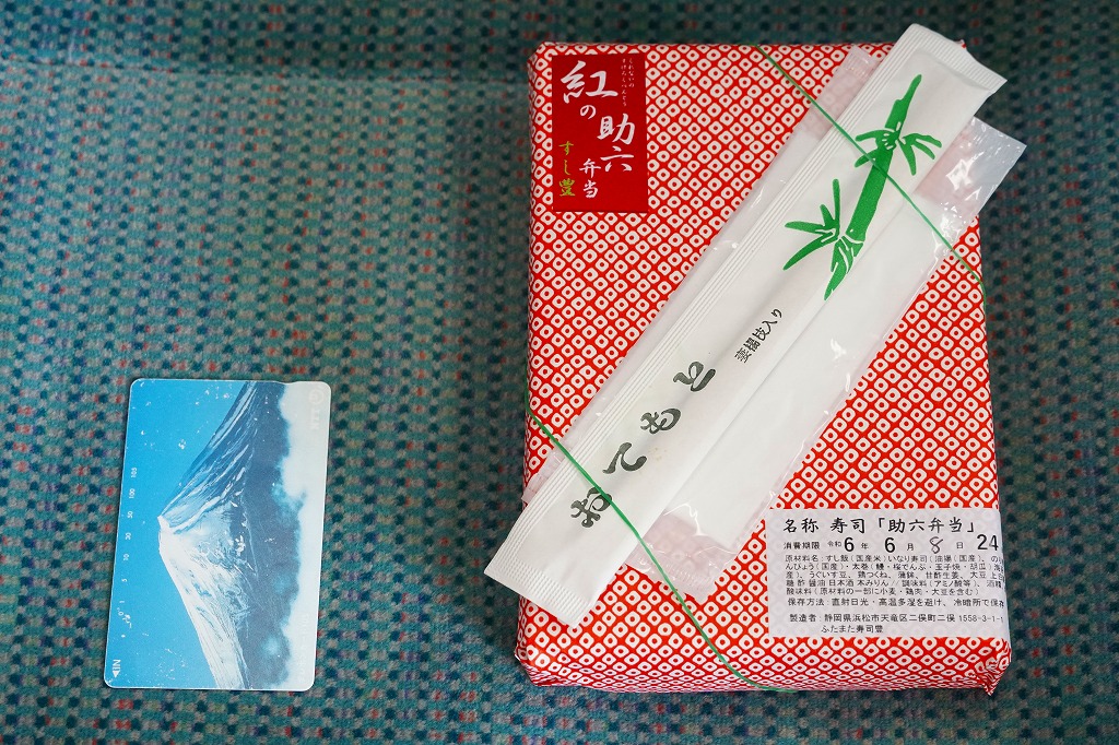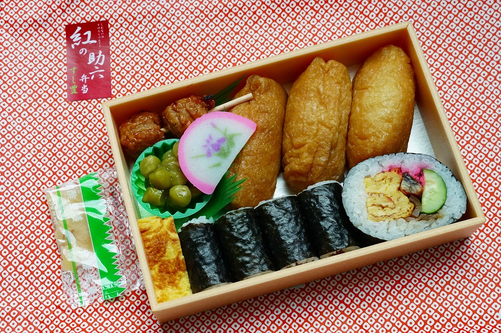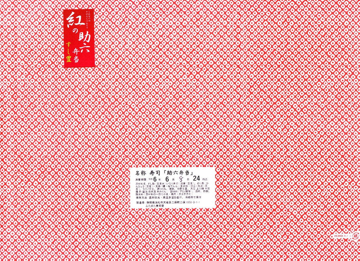 2017(平成29)年に天竜二俣駅で発売。この駅で売られる他の駅弁と同じく土休日の販売で、平日は4個以上の予約販売。平たい長方形の折箱に、稲荷寿司を3個、かんぴょうの細巻きを4本、うなぎ入りの太巻きを1切れ、玉子焼、鶏つくね串、かまぼこ、うぐいす豆を並べ、甘酢生姜の袋を添える。1953(昭和28)年創業のお寿司屋さんの助六と紹介される、古風な内容の助六寿司。調製元は鉄道会社の紹介で「スシトヨ」、包装紙では「すし豊」、食品表示では「ふたまた寿司豊」とある、二俣市街の寿司店「HARU SUSHITOYO」