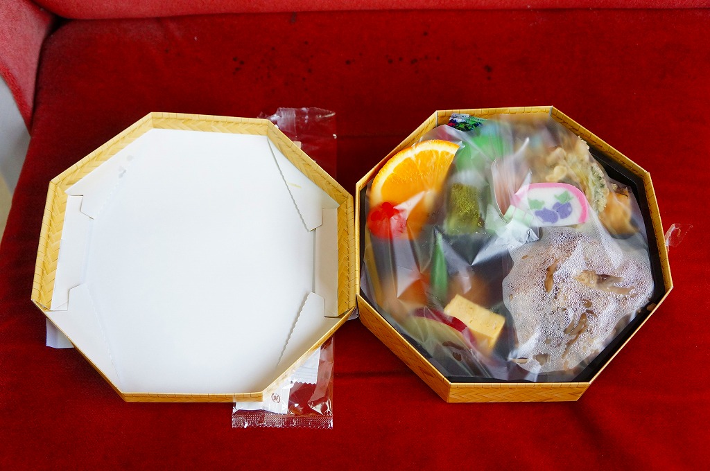 中身は茶飯の遠州での呼び名「さくら御飯」の上に、肉厚のシイタケを指す「どんこ」とウナギ蒲焼を2枚ずつ載せ、アサリやニンジンや錦糸卵で彩り、大根桜漬とわさび漬とゼリーを添えるもの。一言で表せば、うなぎ弁当。残念ながら今回のウナギはゴム草履で、しかし椎茸の出汁はそこそこ、アサリが意外にいい感じ。2018年までの販売か。