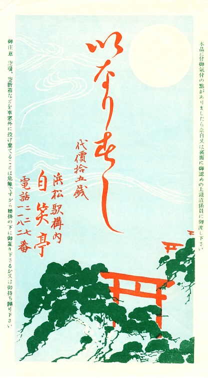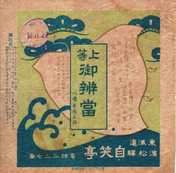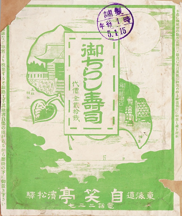 1930(昭和5)年1月15日13時の調製と思われる、昔の浜松駅弁の掛紙。ちらし寿司に「御」を付けるとは恐れ入る。おビールだおコーヒーだと、サービス業では言葉をていねいにしたいがためにやたらに「お」や「御」を付けたがると嘆く批判は、この当時にあったかどうか。五社神社と八幡宮と、おそらく海と松を描く。