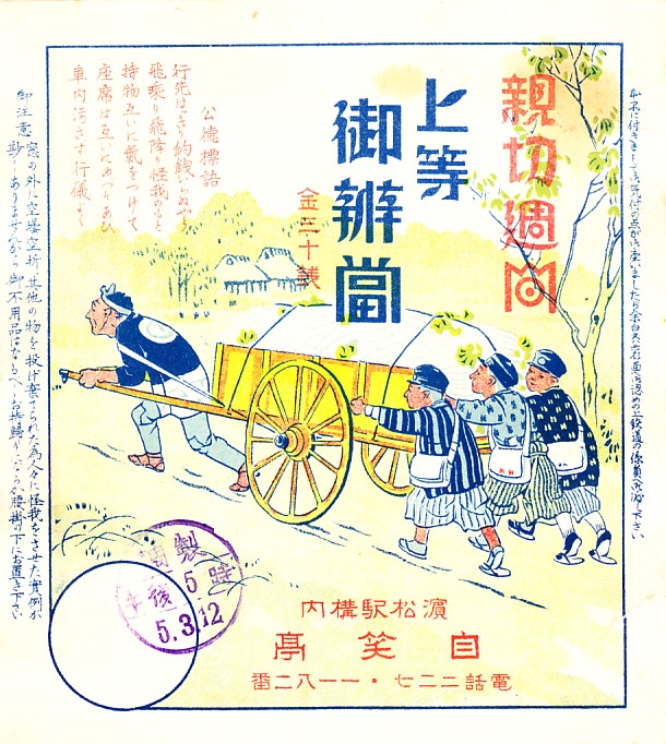 1930(昭和5)年3月12日の調製と思われる、昔の浜松駅弁の掛紙。親切週間とは1930年代の鉄道省で毎年7日間実施されたキャンペーンで、旅客は親切に、荷物は丁寧に、というサービス向上運動だった模様。この掛紙に描いた標語そのものは、旅客を戒めるいつもの感じ。