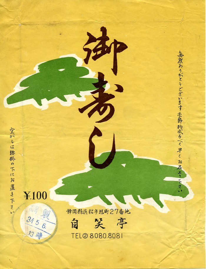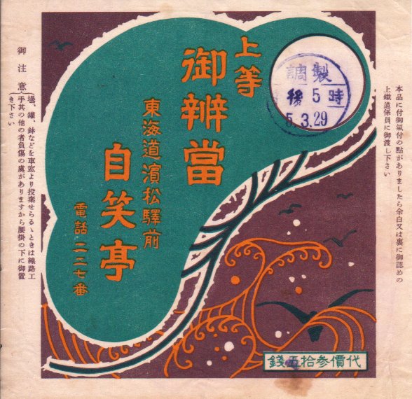 1930(昭和5)年3月29日17時の調製と思われる、昔の浜松駅弁の掛紙。調製元は現在と同じ自笑亭。掛紙のデザインは「浜」に「松」だろうか。