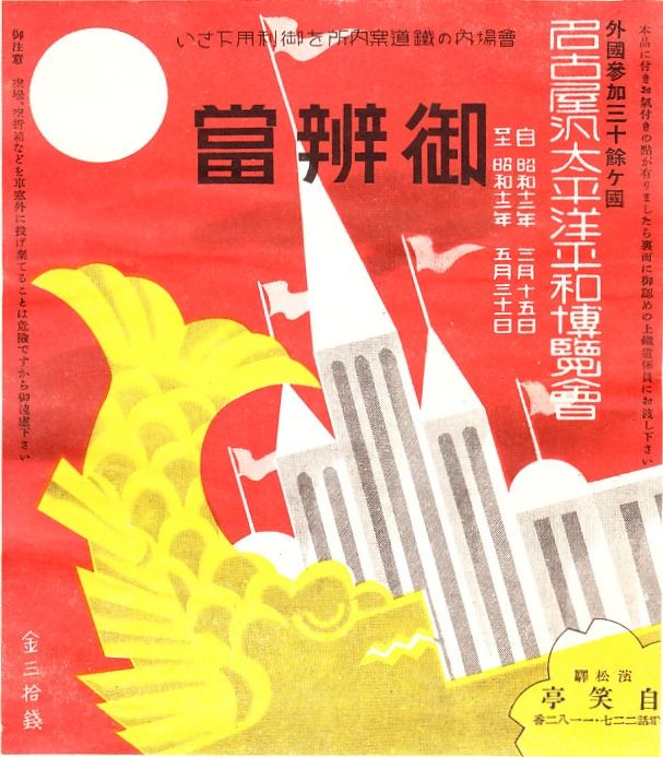 記載事項から1937(昭和12)年のものと思われる、昔の浜松駅弁の掛紙。1937年3月から5月まで名古屋で開催された、名古屋汎太平洋平和博覧会の文字と会期と光景にしゃちほこを描いた、まるで名古屋駅弁のような絵柄の掛紙。静岡駅の掛紙と同じ絵柄。