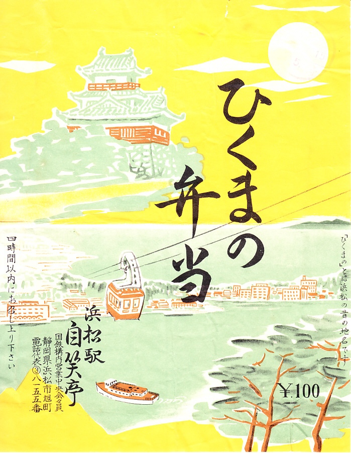 1953(昭和28)年4月4日11時の調製と思われる、昔の浜松駅弁の掛紙。崩し字がきつく、とても読みにくい。曳馬や引馬あるいは引間ないし疋馬(ひくま)は、万葉集の時代からの現在の浜松か豊橋のあたりの地名で、五畿七道の律令時代に東海道の宿駅があったという。浜松は平安時代末期の荘園の名前で、江戸時代にはこの名が地名で定着した。曳馬は浜松市内に現存する地名であるほか、浜松城の前身が曳馬城であった。