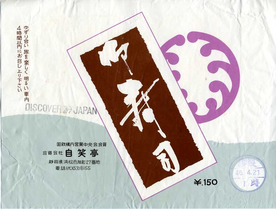 1971(昭和46)年4月21日の調製と思われる、昔の浜松駅弁の掛紙。「DISCOVER JAPAN」のロゴマークが捺印なので、1970年以前に刷った掛紙を流用したのだろう。