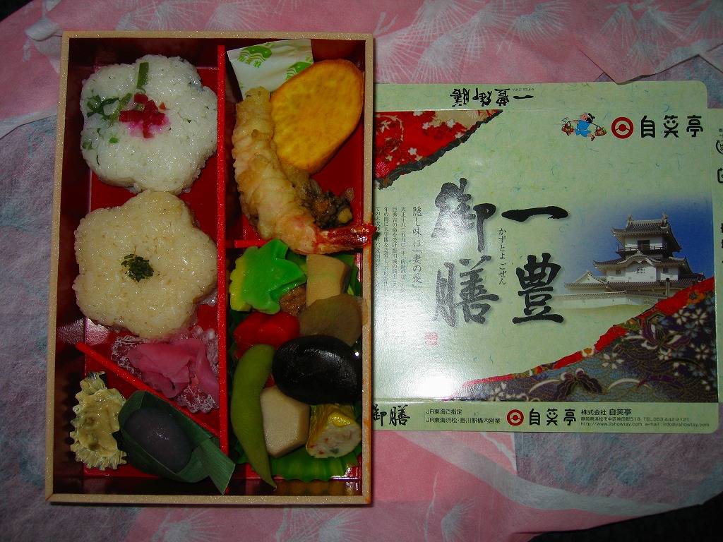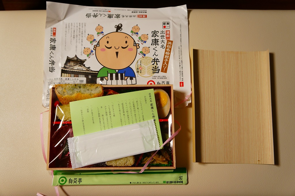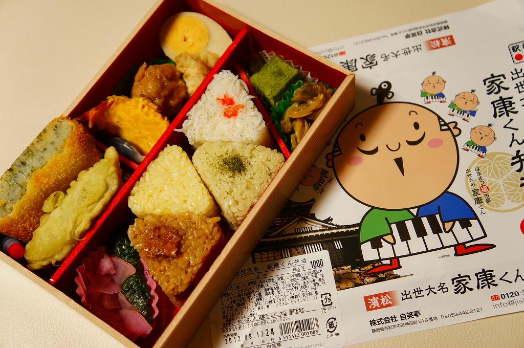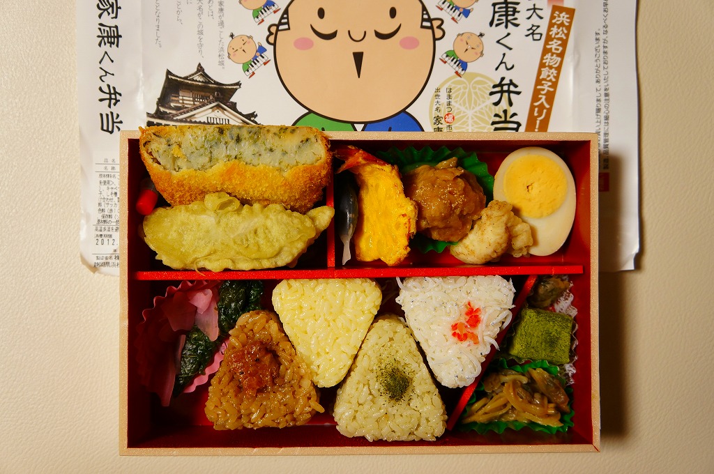 変わった名前をした、浜松駅の並等幕の内駅弁。白御飯のトレーと、焼サバ、エビ煮、玉子焼、焼売、肉団子、アサリ、枝豆、煮物などのおかずを詰めたトレーを、専用の紙箱に収める。プラ製トレーに散らしながら粒を揃えて整然とさせる見た目はきれい。しかしそんな容器のせいか、気分的なものか、味は近隣の駅弁屋よりは今一歩だったような。価格は2010年時点で800円、2014年4月の消費税率改定で830円、2020年時点で850円、2023年時点で900円。