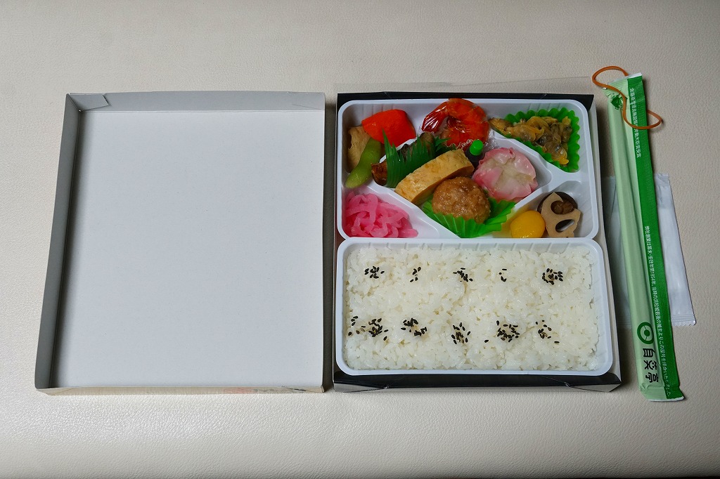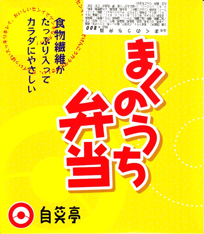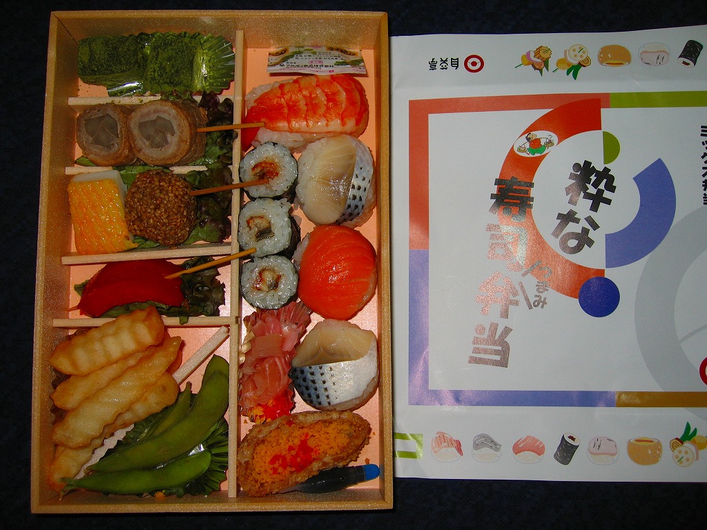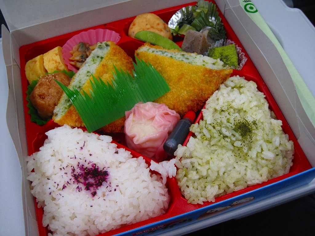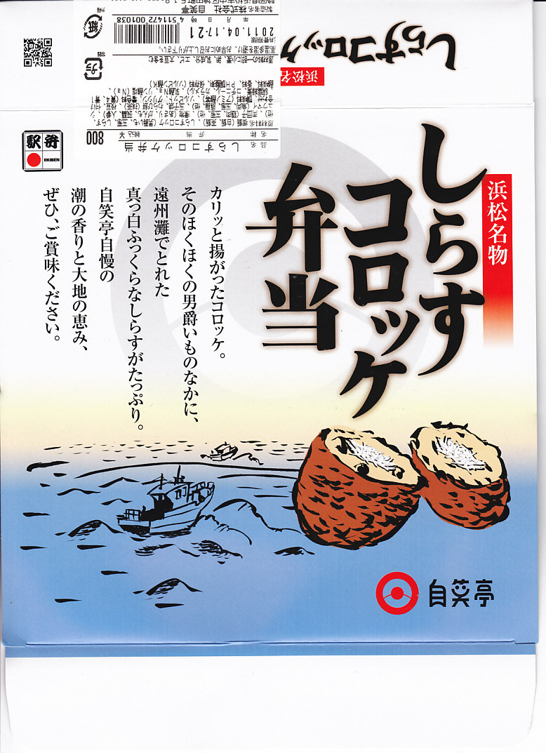 2010(平成22)年の夏までに発売か。正方形のボール紙の容器には、シラス入りコロッケと遠州灘の簡単なイラストと宣伝文が描かれる。赤いプラ製トレーに収まる中身は、白御飯と緑茶飯、しらすコロッケ、肉団子、アサリ煮、玉子焼、こんにゃくやがんもどきなどの煮物、しゅうまい、わらびもち。この価格ではなかなかの分量で、風味はとても柔らか。価格は2011年の購入時で800円、2014年時点で830円。2014年頃までの販売か。