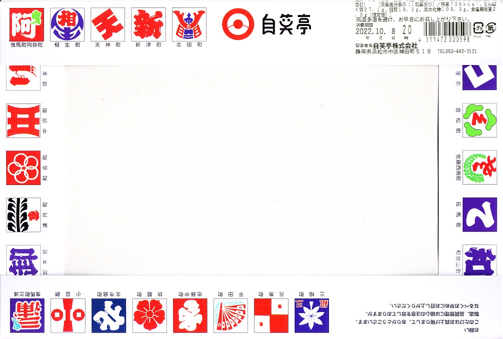2003(平成15)年12月20日に購入した、浜松駅弁のふた。1987年の発売時の掛紙から、上記の2022年時点まで、その絵柄は変わらない。中身も2022年と変わらない。発売当時の祭の賑やかさのコンセプトや内容はすでに失われ、幕の内弁当の一種となっていた。
