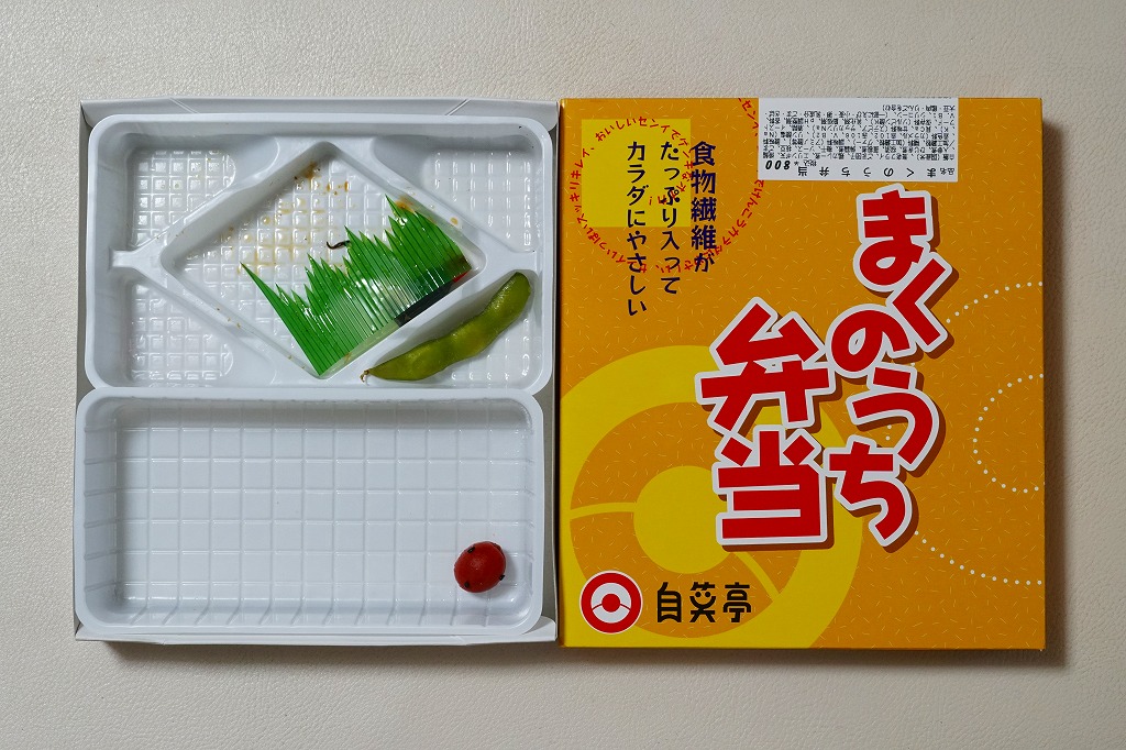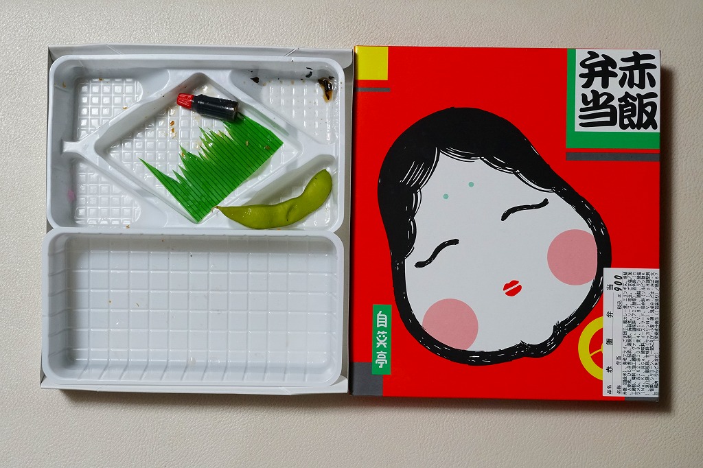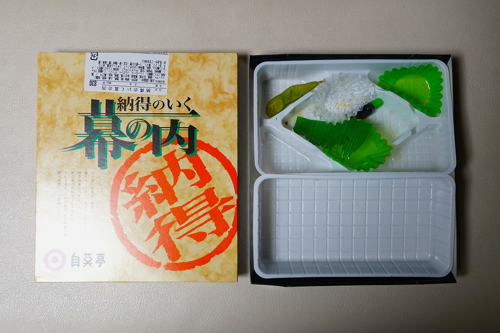 中身の見栄えは惜しいが、風味は並。分量もこんなもの。それより何より、こんな時代遅れの駅弁がいまだに売られ続け、買われ続けることは、ひとつの文化だと思う。もう一回り時代が進んだら、復刻掛紙でもかけてあげたい気がした。2011年までの販売か。
