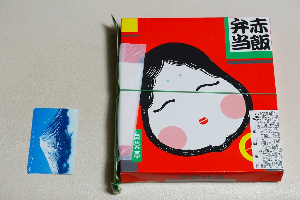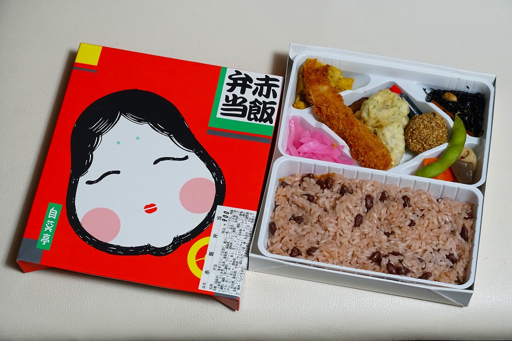 1975(昭和50)年3月の発売か。その名のとおり、浜松駅弁の赤飯弁当。赤地におたふく顔の、ふたの絵柄が印象的。ボール紙の容器にふたつの白いプラ製のトレーを入れ、一方が赤飯、他方がおかずで、海老フライ、ごま団子、鶏カレー煮、エリンギ天、焼さば、にんじん、れんこん、こんにゃく、ひじき煮、大根桜漬。つまり、上記の浜松駅弁「まくのうち弁当」の、御飯を赤飯に替えたもの。価格は2004年時点で760円、2013年時点で810円、2014年4月の消費税率改定で840円、2020年時点で860円、2022年時点で900円。
