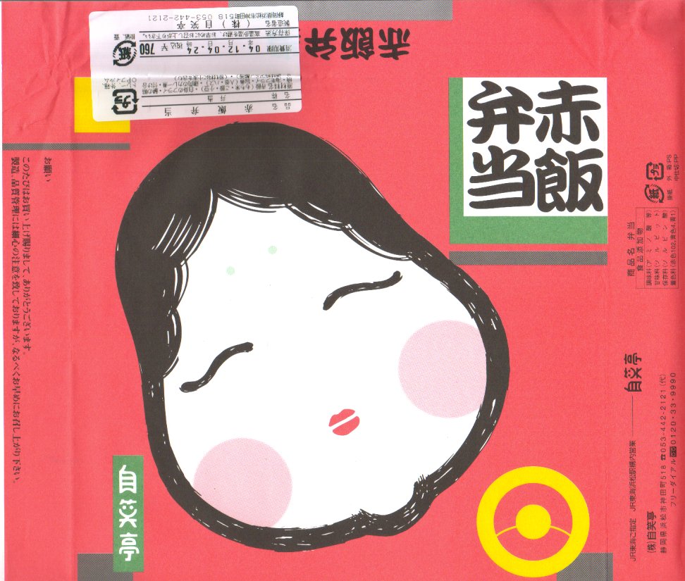 2004(平成16)年12月4日に購入した、浜松駅弁の掛紙。その絵柄は、上記の2022年のふたと変わらない。おかずに違いはあるが、赤飯弁当であることに変わりない。