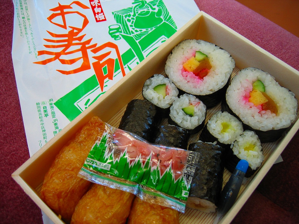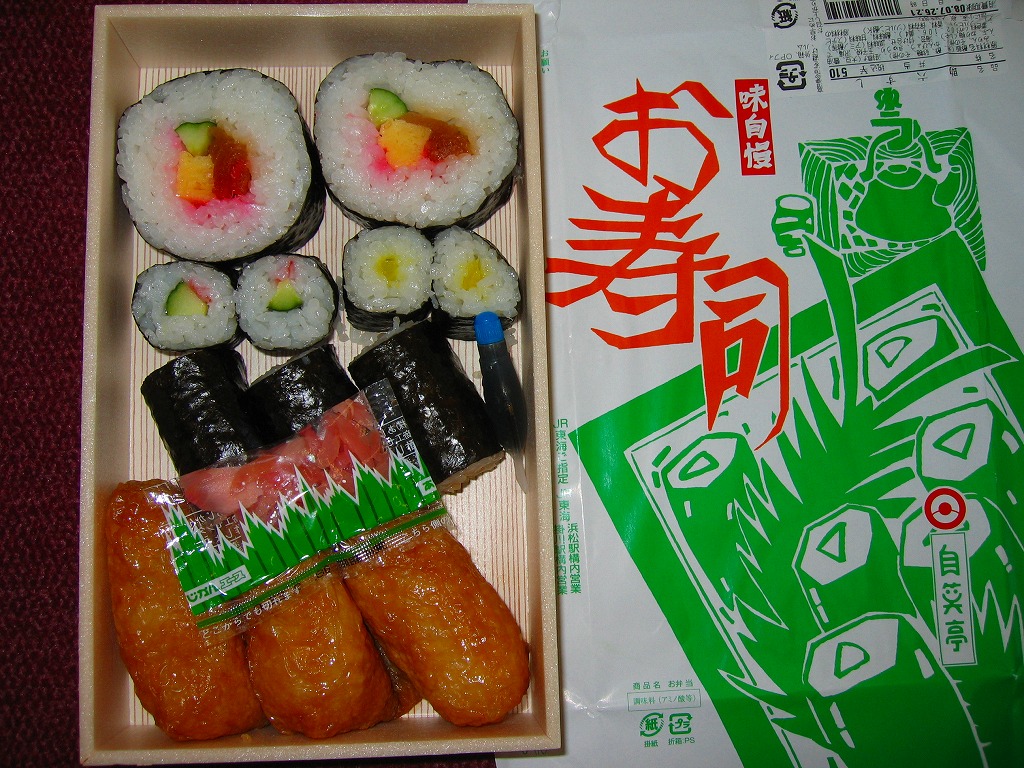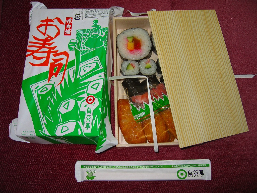 浜松駅の普通寿司駅弁。太巻き2個、細巻きのきゅうり2個、たくあん2個、かんぴょう3個、いなり3個を、長方形の容器に詰めて、木目調のボール紙でふたをして、21世紀には見栄えのしない掛紙をかけて、ひもで十字にしばる。