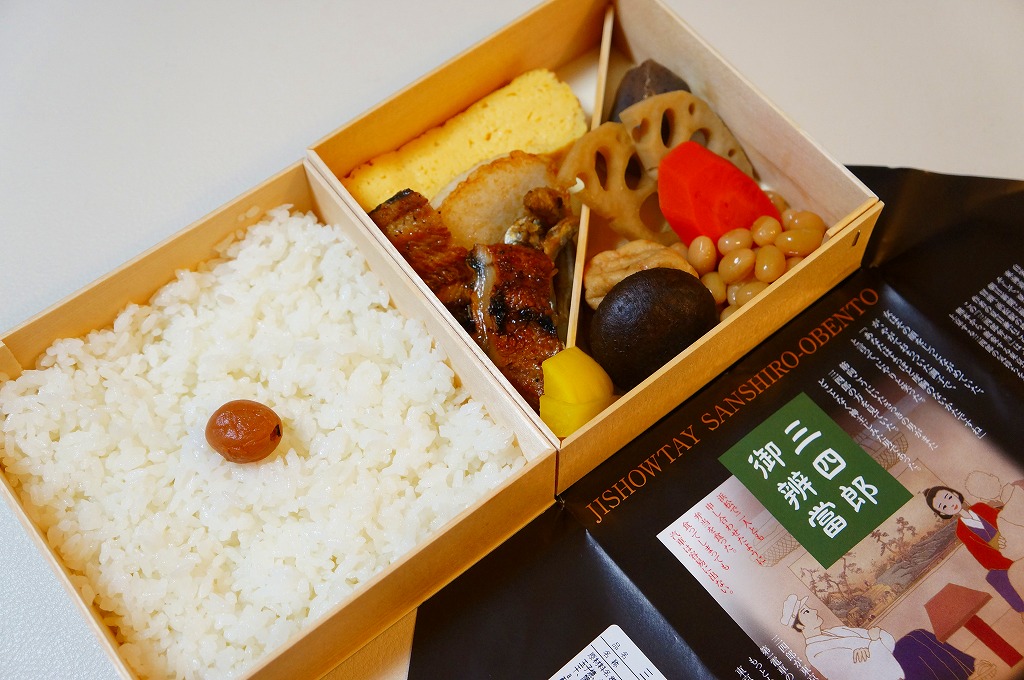 中身は当時の雑誌の記述により「細鰻、玉子焼、蒲鉾、河魚佃煮、蓮、椎茸を副食とし一寸体裁も佳く先ず普通上等の部類なり」を再現。下段に日の丸御飯、上段にこれらの茶色いものばかりを詰める。ウナギの質は残念に思うも、煮物や焼かまぼこなどの風味は良好。駅弁のコンセプトにこれだけ筋を通したものには、なかなか出会えないと感心した。2014年頃までの販売か。