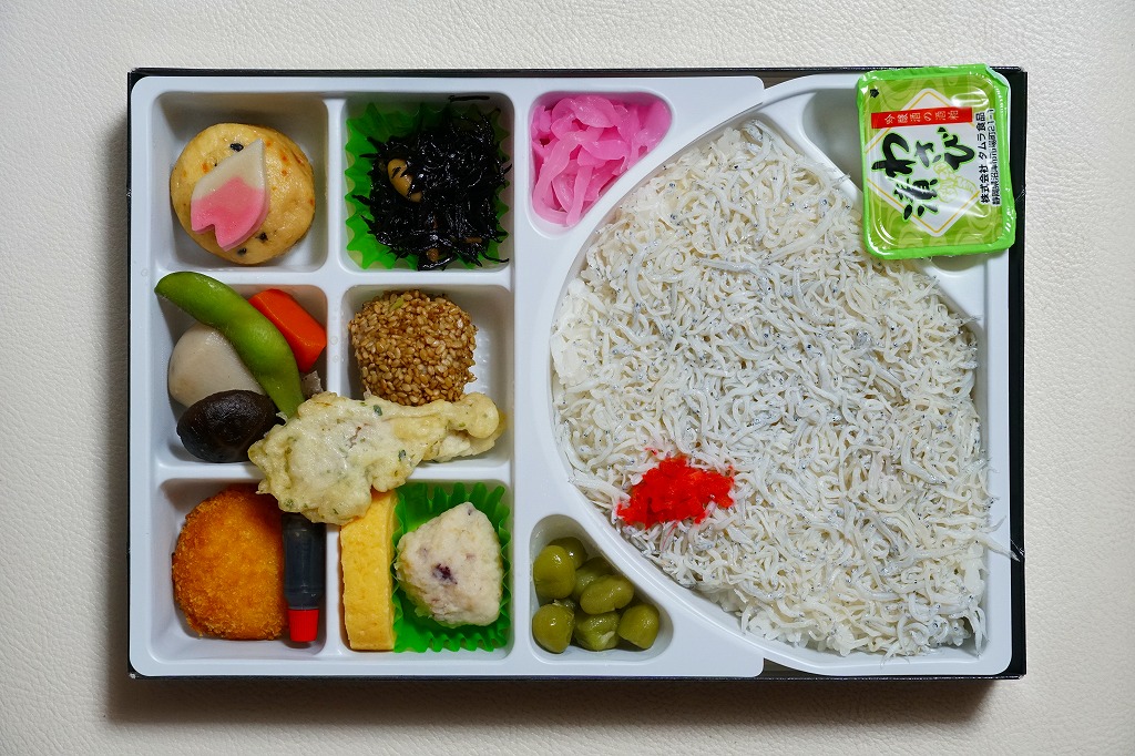 1980年代の発売か。しらすの白い写真でできたふたには、表面にも裏面にも宣伝文が豊か。白いトレーのトンネル形か半円形の部分に、白飯を詰めて、しらすの塩ゆでで覆い、紅生姜で彩り、わさび漬とうぐいす豆と大根桜漬を添える。小さな6区画のおかずは、ひじき、ごま団子とエリンギ天、玉子焼とイカボール煮、魚すり身フライ、煮物、がんもどき。