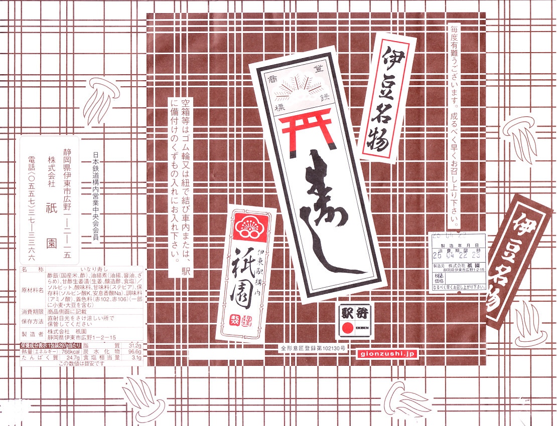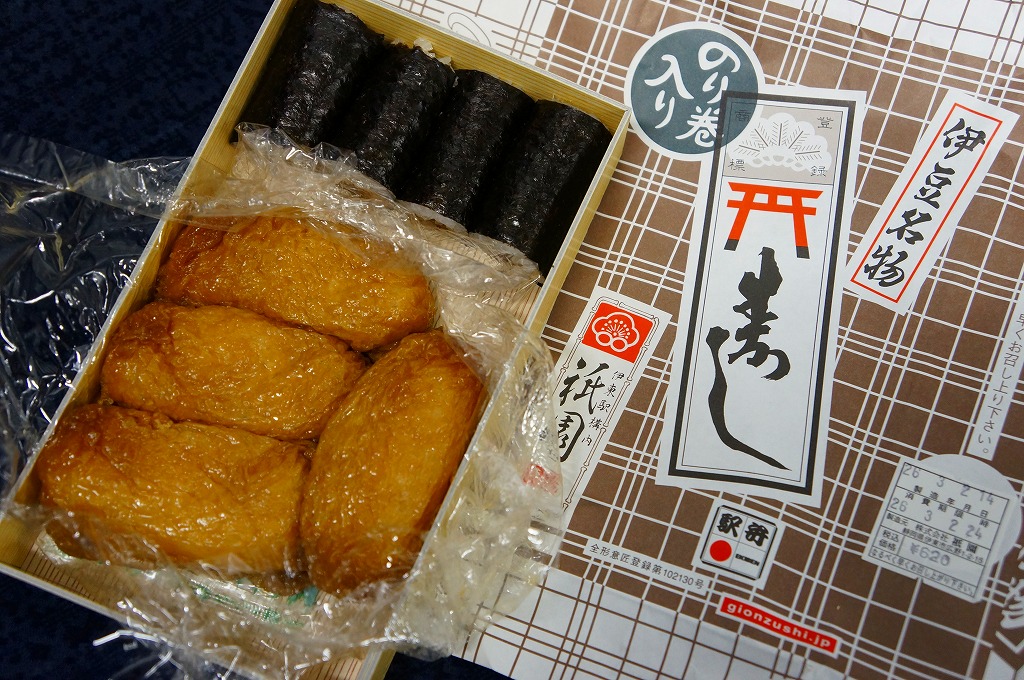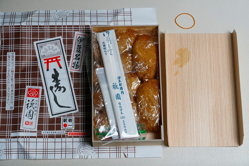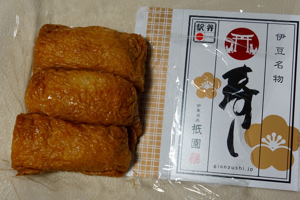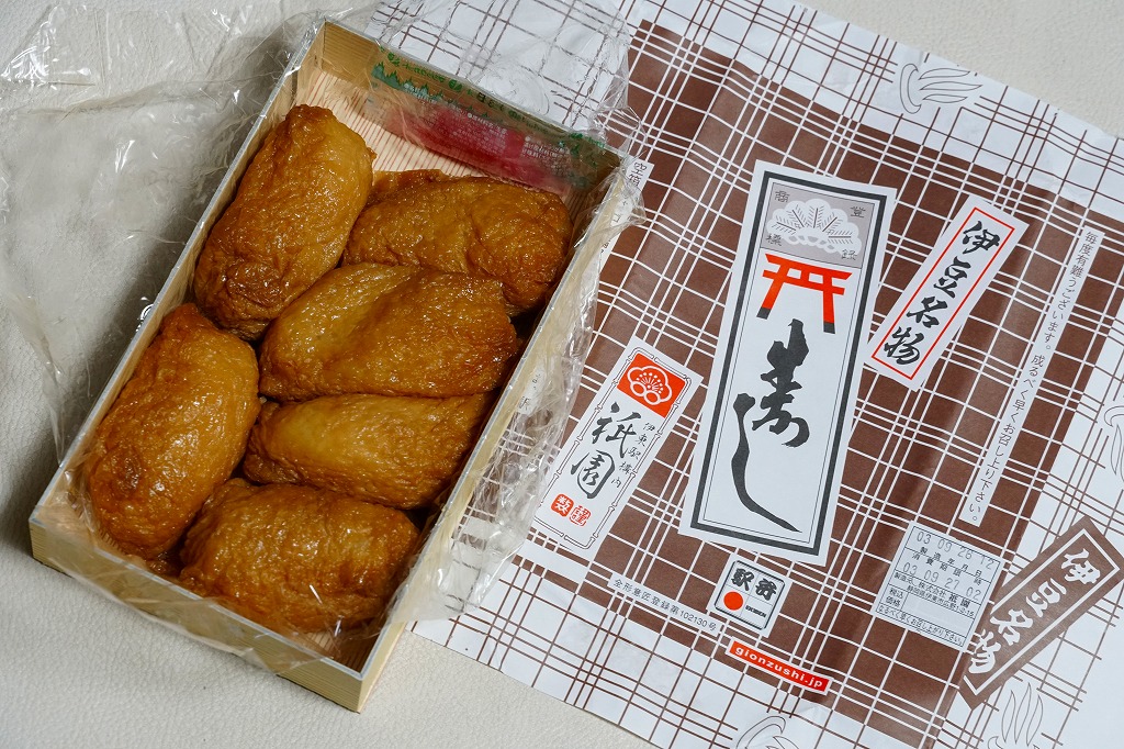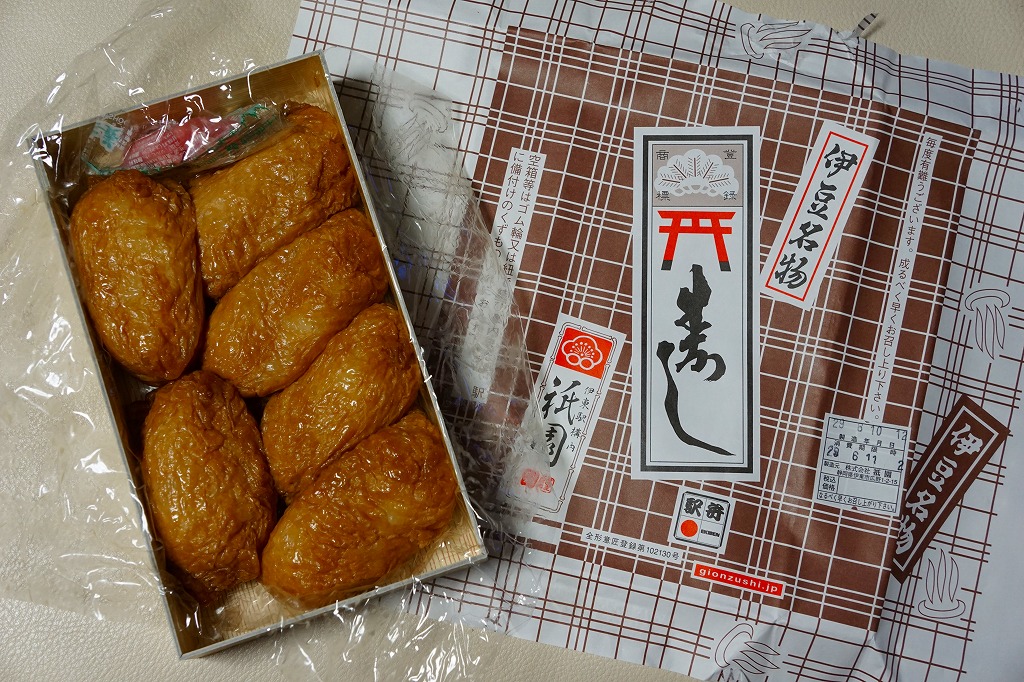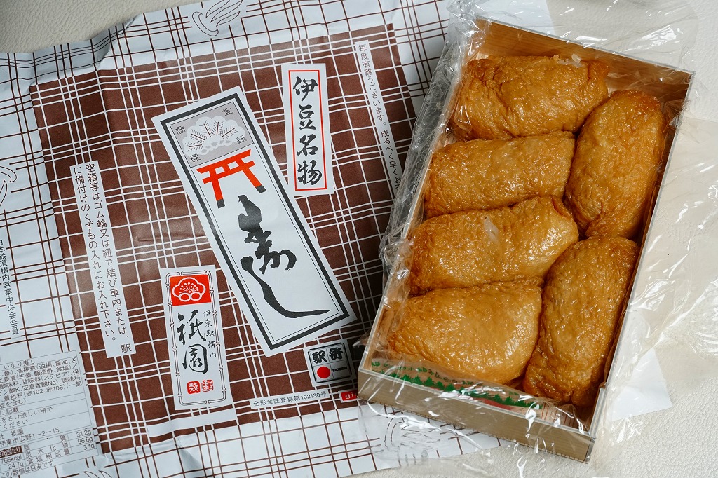伊東駅では1959(昭和34)年3月に発売。稲荷寿司駅弁の最高峰、あるいは東の伊東駅、西の豊橋駅と並び称される逸品で、地元の伊東で愛されるおいなりさん。調製元は1946(昭和21)年に伊東で稲荷寿司店として創業し、評判をもって当時の国鉄伊東駅に進出した。