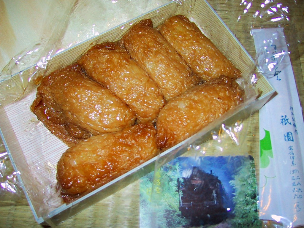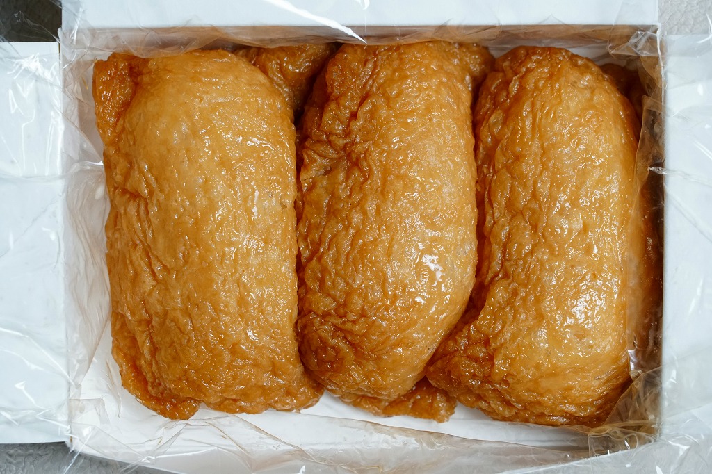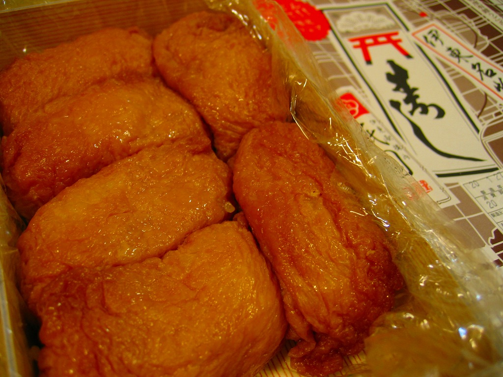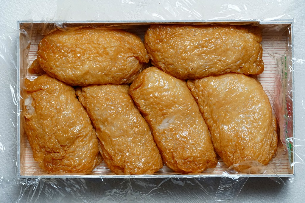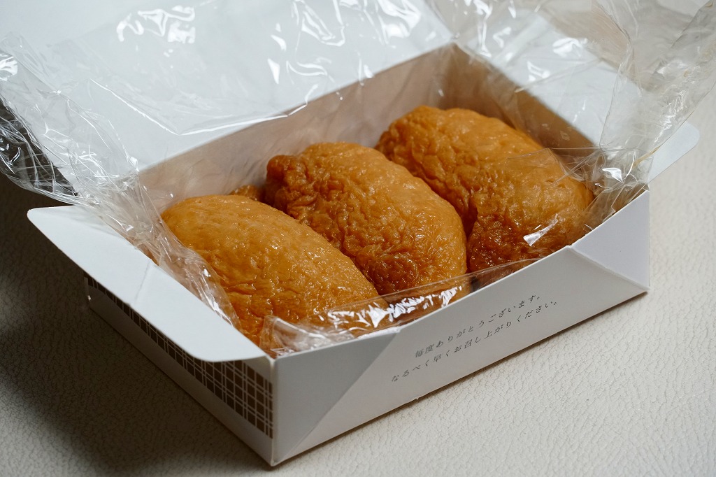 外見は変哲のないおいなりさんが6つ。これらをまとめてラップで包み、ボール紙の容器に収め、木目柄のふたをして、包装紙でぴったり包む。辛さも甘さもほどほどで、酢飯はもちっとした食感。満腹でも食が進むような味に、その人気がうかがえる。毎年秋の明治神宮の例大祭に献上されるという売り文句もある。