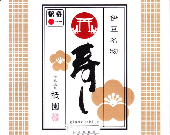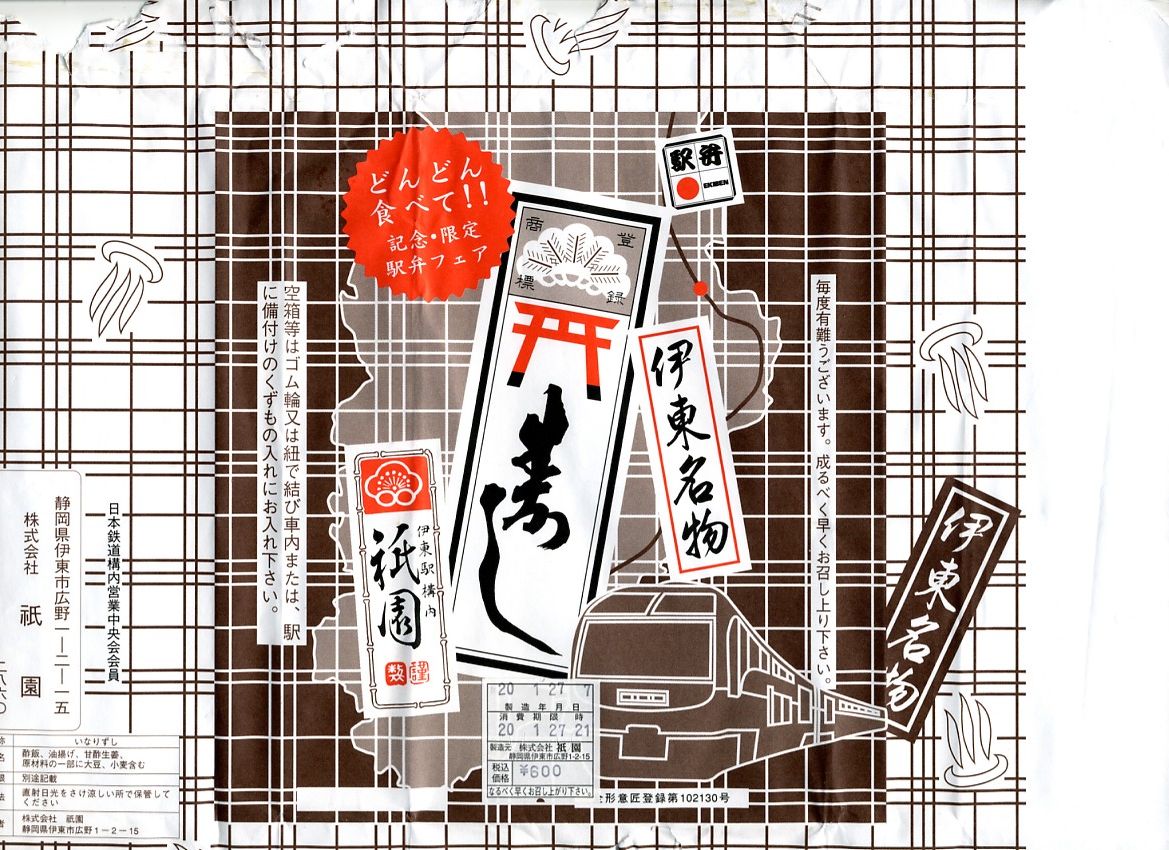 2008(平成20)年1月27日の調製である、伊東駅弁の包装紙。JR東日本横浜支社が2008(平成20)年1月26日と27日に、管内の駅弁屋4社(崎陽軒、大船軒、東華軒、祇園)を集めて横浜駅西口で実施したイベント「どんどん食べて!!記念・限定駅弁フェア」にて販売されたもの。いつもの絵柄に伊豆半島や特急電車やイベント名を加え、伊豆名物の表記を「伊東名物」に差し替えた、過去の伊東駅弁では記憶にない限定特別版だった。容器は中身は通常版の6個入りと同じ。