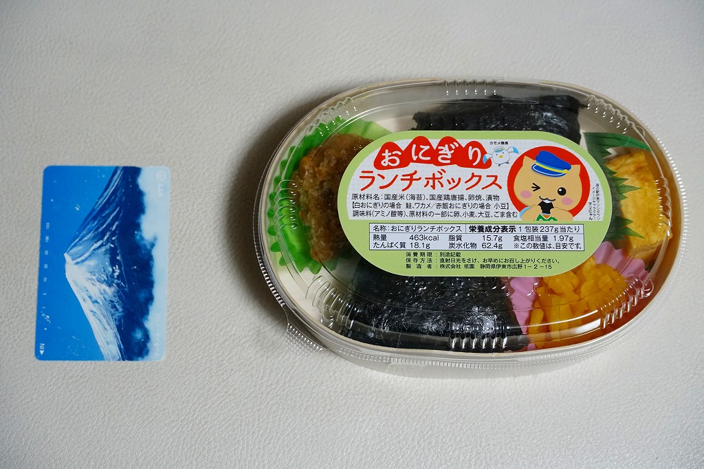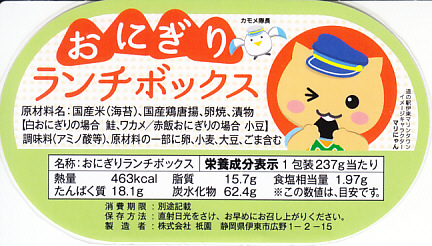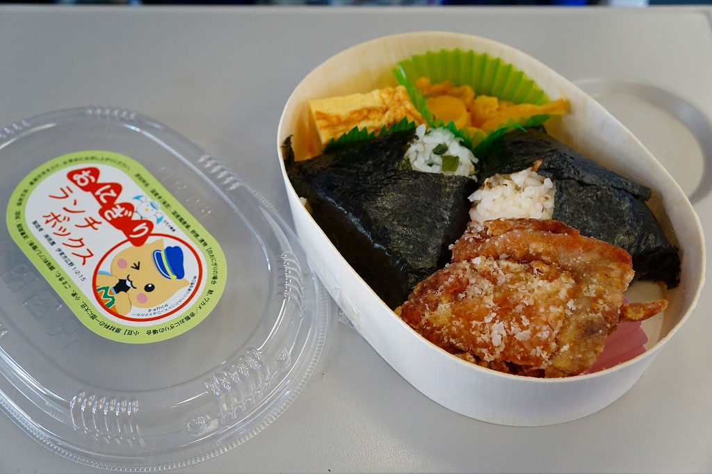 駅弁の名前は「おにぎり弁当」とも。薄手のボール紙を使った細長い直方体の容器の中に、これまた細長い白いトレーが入る。中身はおむすびが3個と、大きめの鶏唐揚がひとつ、他にはごぼうや玉子焼など。この値段で味と量はちゃんと確保されている。価格は2002年の購入時で600円、2010年時点で630円、2014年時点で680円、2017年12月27日から710円、2020年2月から720円、2022年1月から730円、12月28日から760円、2023年8月から800円、2024年時点で840円、11月から880円、2025年時点で940円。調製元の廃業により、2025年9月限りで終売となった。