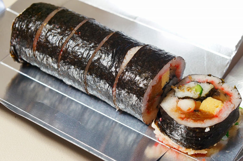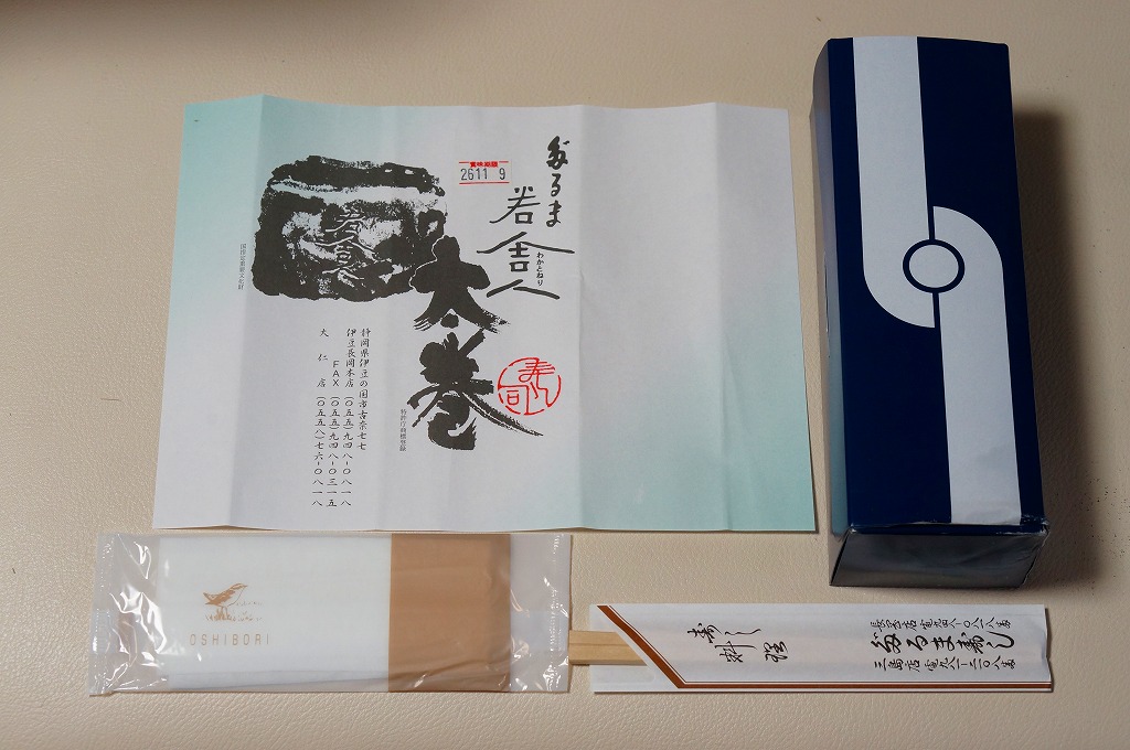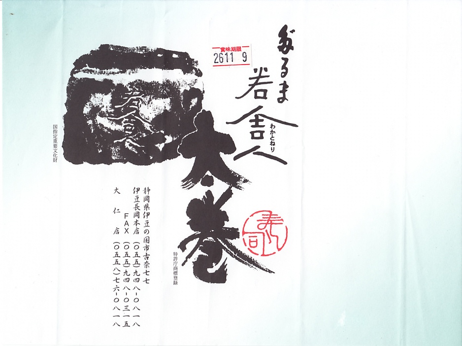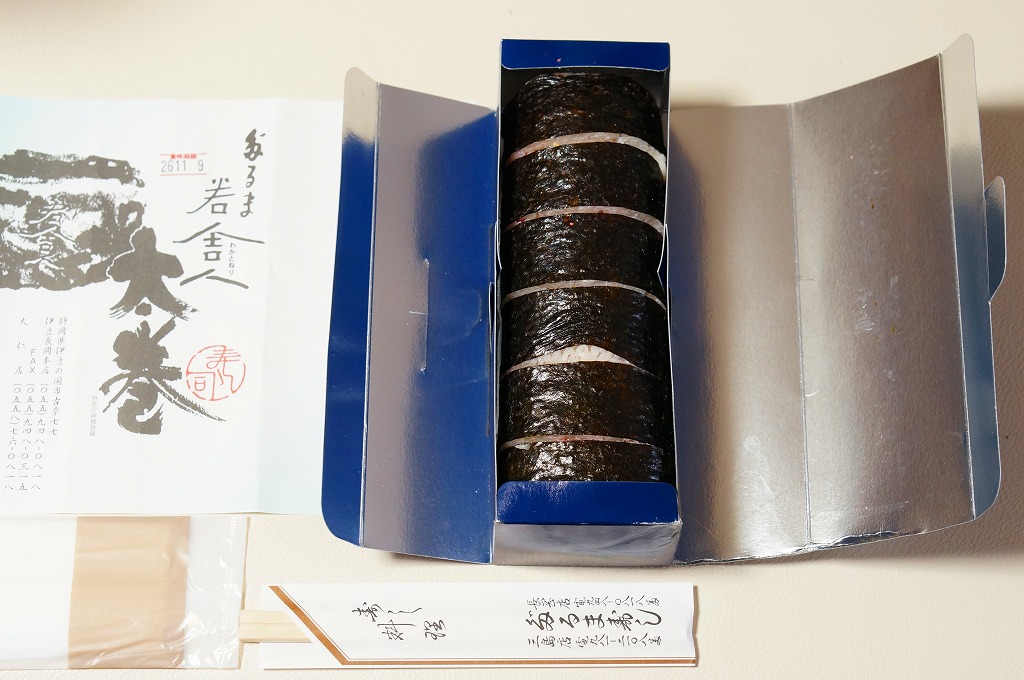 温泉地の玄関口でもある、伊豆箱根鉄道の駿豆線の伊豆長岡駅で買えた商品。棒寿司向けのボール紙製容器に、商品名の掛紙を巻く。中身は6切れ1本の太巻き寿司のみ。米一合に、かっぱ巻き(キュウリの細巻き)、海老、かんぴょう、伊豆産干し椎茸、玉子焼き、鰈(カレイ)のおぼろと、伊豆の食材を豊富に使った太巻という。駅弁というよりはむしろ、調製元の寿司割烹の名物料理として駅や農協売店、時には百貨店の催事でも売られる。