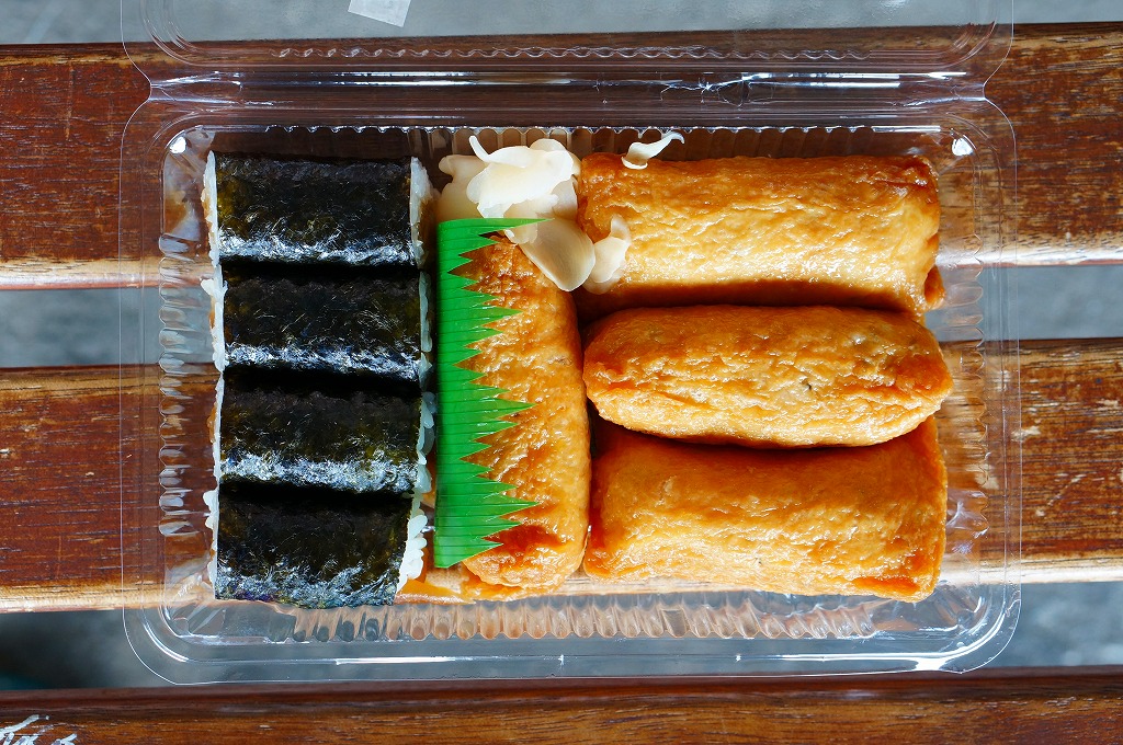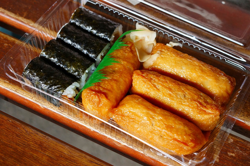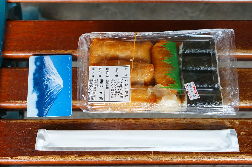 温泉地の玄関口でもある、伊豆箱根鉄道の駿豆線の伊豆長岡駅で、以前から売られているらしい商品。透明なプラ容器に、いなりずし4個と、かんぴょうの細巻き4個と、ガリのみを詰めたお弁当。きれいな味に加えて、ただの惣菜にしては整った見栄えも印象的だった。調製元は地元の寿司割烹で、後にJR三島駅にも同社の商品が置かれるようになる。