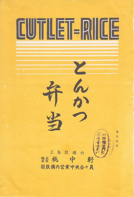 1970年代のものと思われる、昔の三島駅弁の掛紙。黄色い掛紙のトンカツ弁当に「CUTLET-RICE」の英語をあてた。