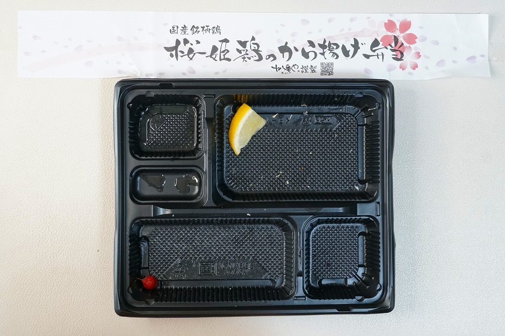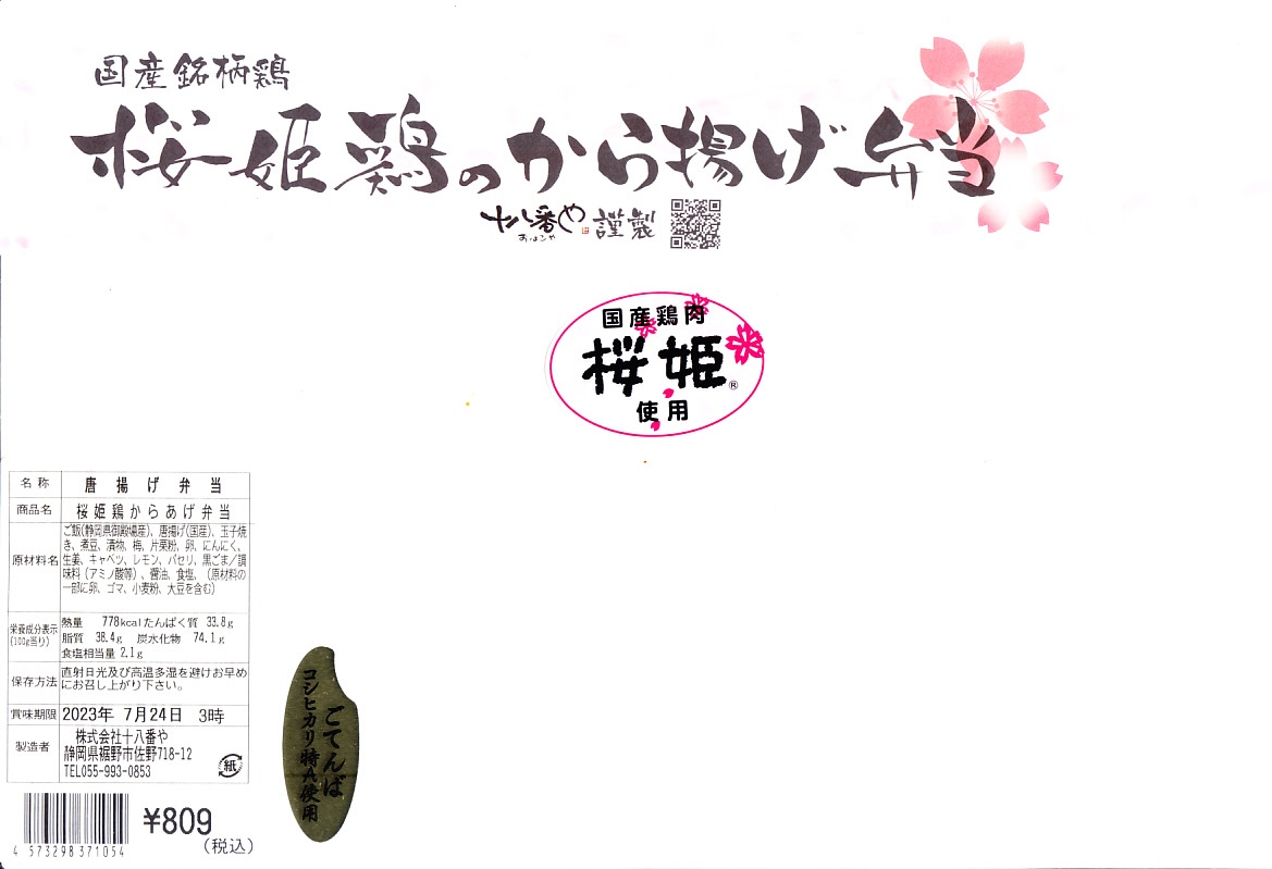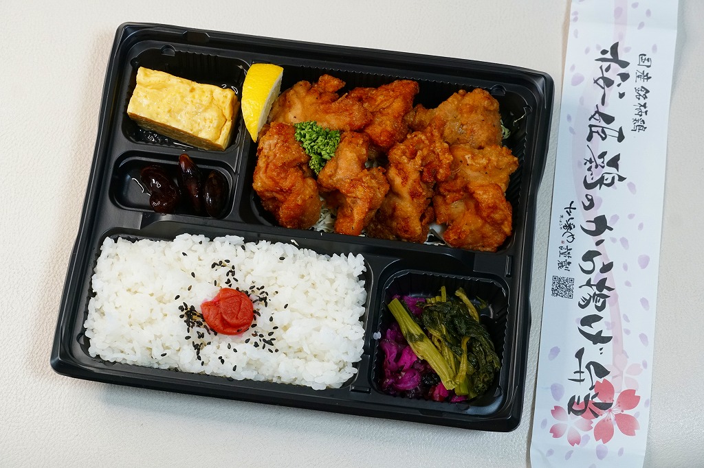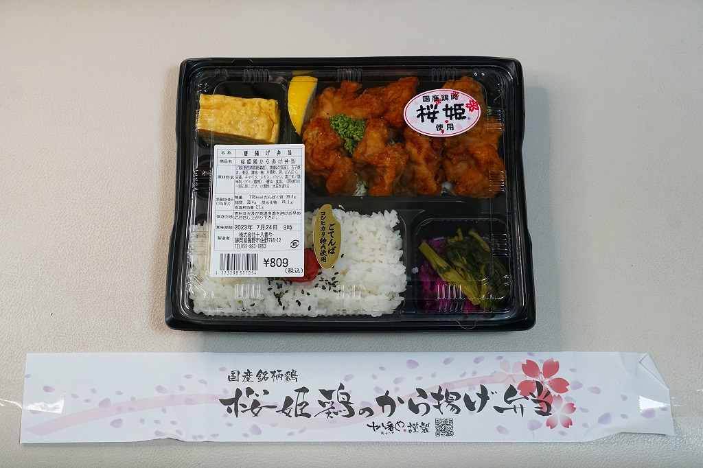 2019(平成31)年12月18日までには三島駅の売店「ベルマート」で発売か。惣菜弁当向けの平たいプラ製トレーに、日の丸御飯、桜姫鶏のから揚げ、玉子焼、煮豆、漬物を詰める。ここで使われた国産銘柄鶏ないし国産鶏肉の「桜姫」とは三島や静岡のものでなく、食肉最大手の日本ハムが2001年から各地で生産し全国で販売する商品。コンビニ弁当のようなものだが、この調製元の弁当は三島駅のJR東海グループのコンビニ「ベルマート」で、まるで駅弁のように鎮座し紹介されるので、ただのコンビニ弁当でない感じ。商品名を書いた紙帯を締める姿も、駅弁未満でもコンビニ以上のお弁当。調製元は自社公式サイトでは、静岡県三島のラーメン店チェーンとする。価格は2019年時点で680円、2023年時点で809円。