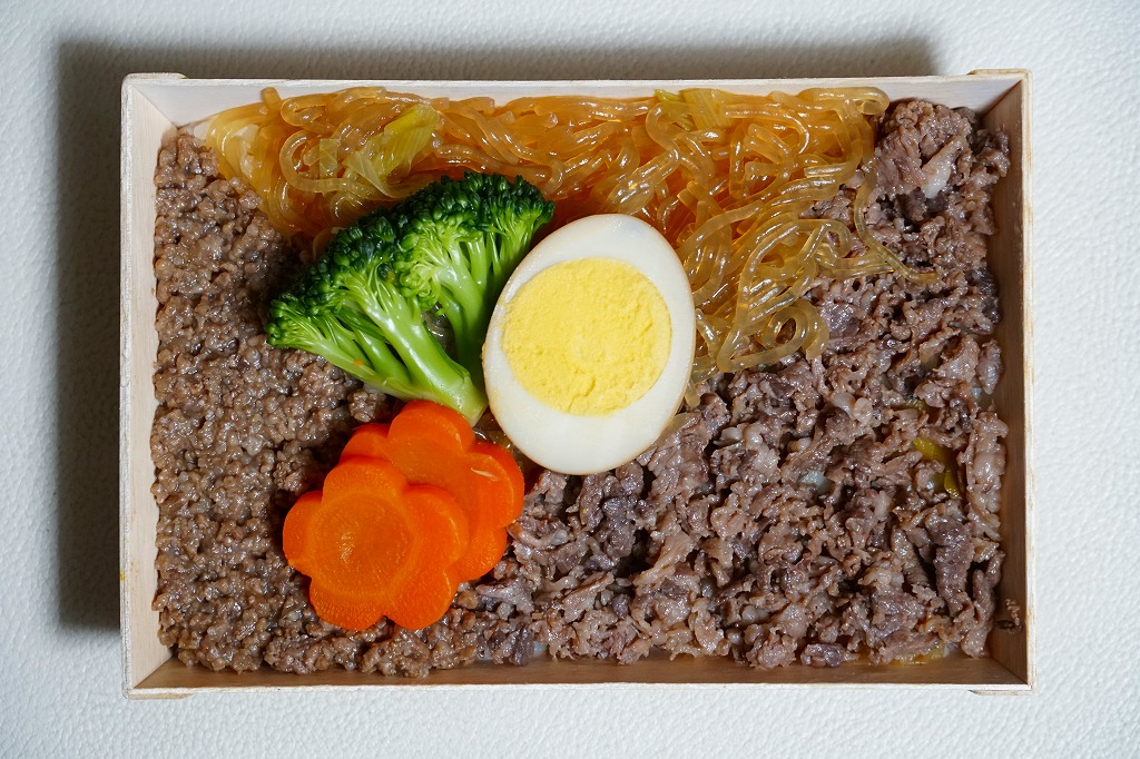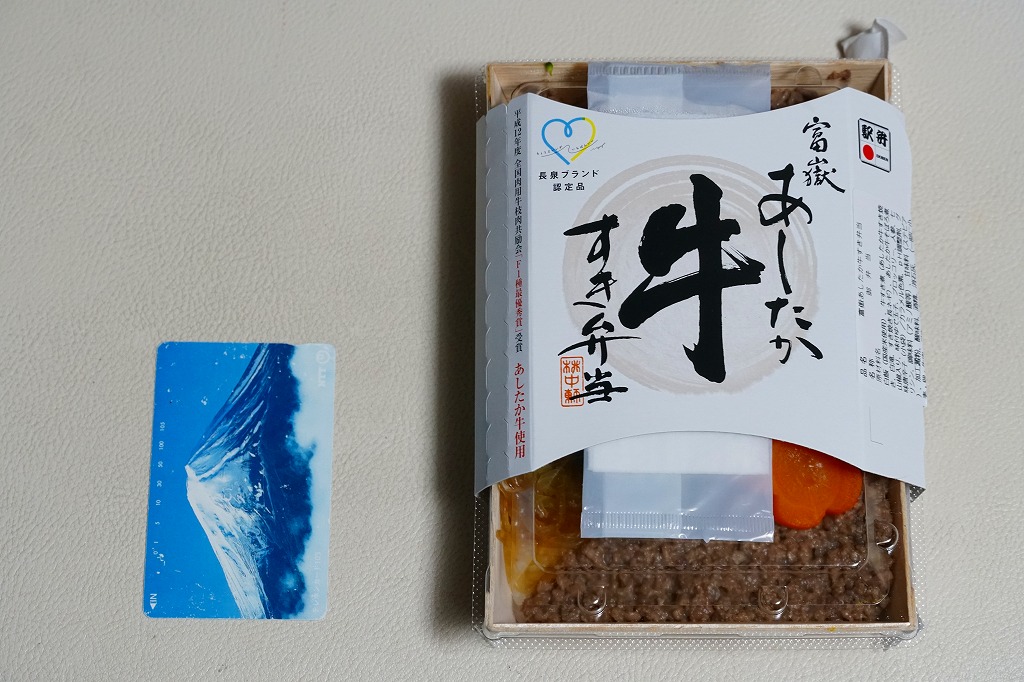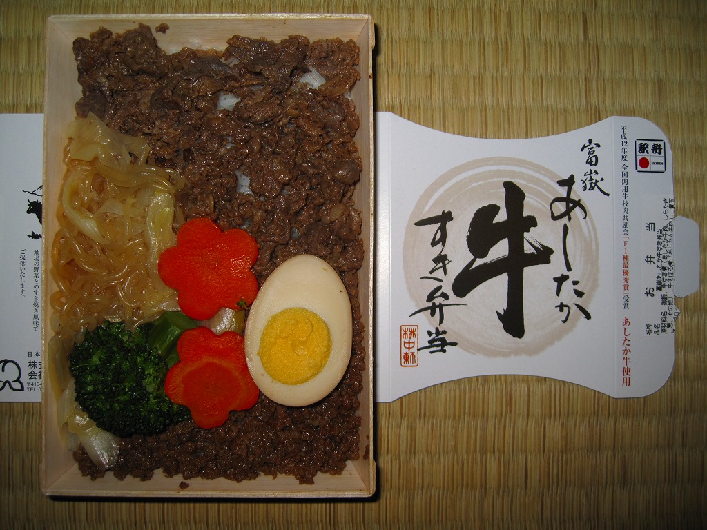 中身は白御飯の上に「あしたか牛」の牛すき煮と牛そぼろ煮を載せ、しらたき、煮玉子、ブロッコリー、ニンジンを添えるもの。駅弁の名前どおりのすきやき弁当。甘辛で程良い赤身と固さがある牛肉に食が進む。価格は2010年時点で930円、2014年4月の消費税率改定で960円、2016年時点で980円、2018年時点で1,030円、2019年時点で1,060円、2020年時点で1,080円、2022年3月6日から1,180円、2024年7月24日から1,230円、2025年3月から1,380円。