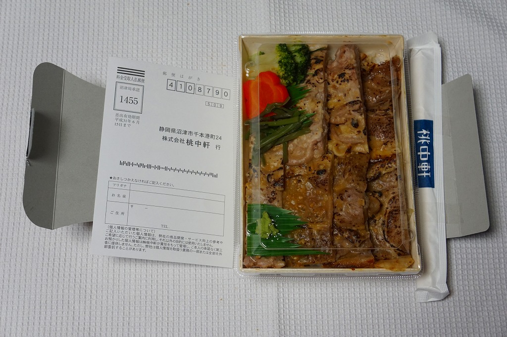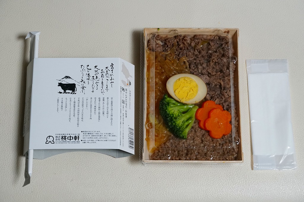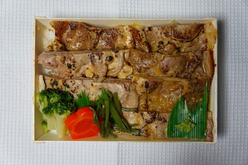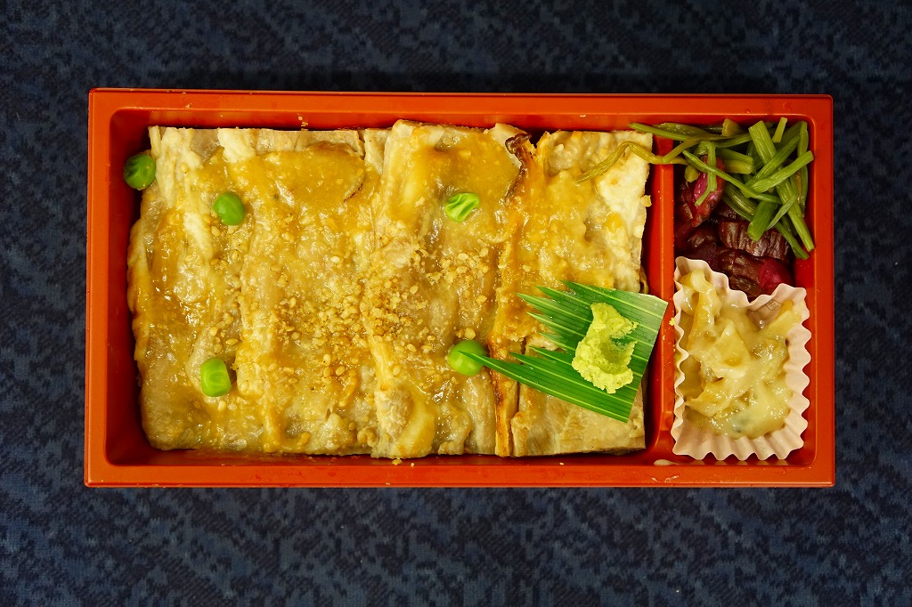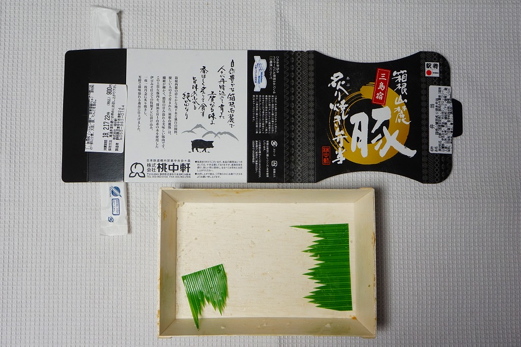 2017(平成29)年11月13日に下記の駅弁「ぶたのみそ仕込み弁当」をリニューアルしたというが、ほぼ似てない新作に見える。木質のエコ容器に透明なふたをして、四面に商品名や宣伝文を書くボール紙のスリーブに収める点から、旧作とまるで異なる。その容器に白飯を詰め、商品名どおりの箱根山麓豚の炙り焼きで覆い、ブロッコリー、ニンジン、山セリ、わさびを添える。冷たくても硬くなく臭くない、焦げ目で香りを引き立てた厚めの、箱根山麓豚の伊豆みそ仕立ての炙り焼きは、かなりいけた。価格は2017年の発売時や2018年の購入時で900円、2023年時点で970円、2025年3月から1,080円。