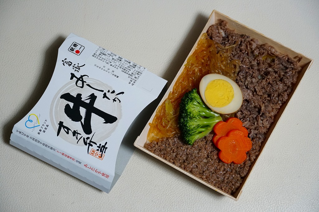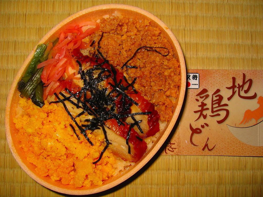 2008(平成20)年に下記の駅弁「地鶏どん」をリニューアル。茶飯を鶏そぼろと玉子そぼろと鶏照焼で覆い、グリーンピースと大根桜漬と刻み海苔で彩る構成は、以前とだいたい同じ。丸い容器が四角くなり、ボール紙枠の大きさは倍くらい、鶏照焼の分量は3倍くらいになった。価格は2008年のリニューアル時で700円、2014年4月の消費税率改定で720円、2018年時点で740円、2020年時点で760円、2024年時点で880円、2025年3月から950円。