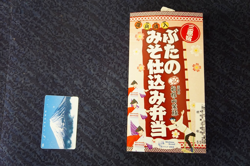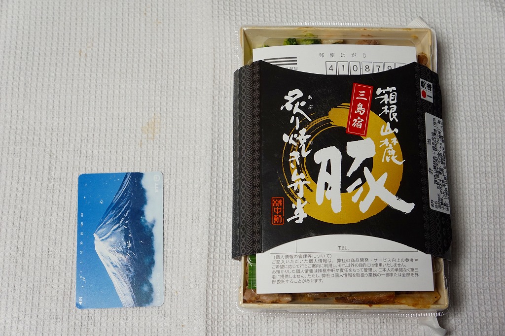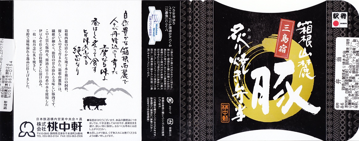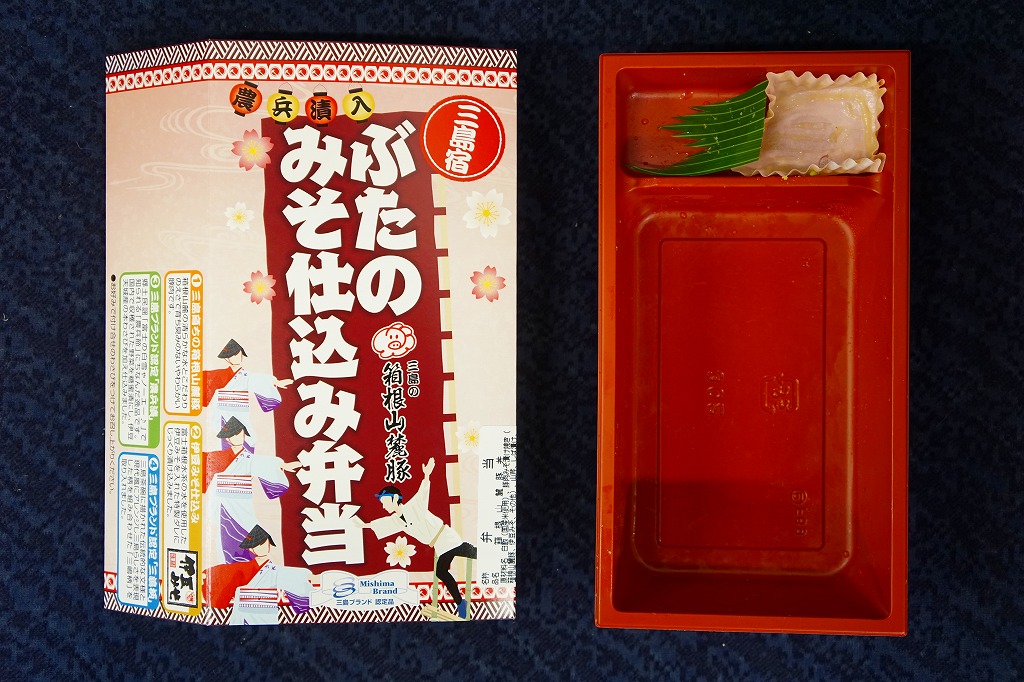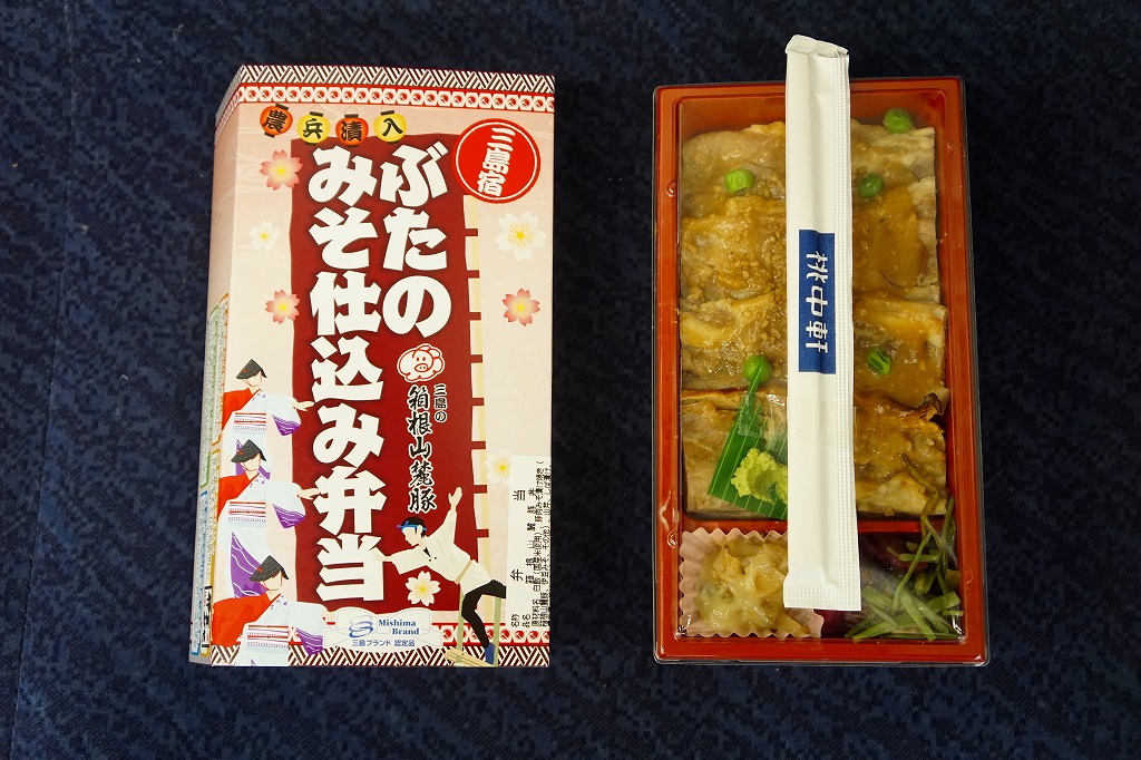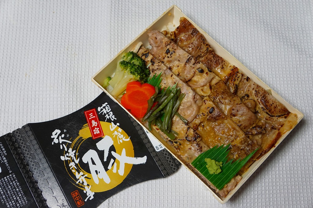 2012(平成24)年7月15日の発売。2014(平成26)年9月1日のリニューアルというが、変化はほぼなかった模様。長方形の容器に白御飯を詰め、伊豆みそを原料とした特製のタレに漬けてから焼いた、三島育ちの「恵比寿豚」の肉で覆い、漬物などを添える。食べれば味噌味な普通の豚丼駅弁。静岡ないし伊豆の名産とされるワサビを、練りワサビとワサビ漬で、容器も袋も使わずに入れており、東京駅で買える駅弁とは違うことをアピールしたような感じ。価格は2012年の発売時や2014年のリニューアル時で780円、2017年の購入時で830円。2017(平成29)年11月に上記の「三島宿箱根山麓豚炙り焼き弁当」へリニューアル。