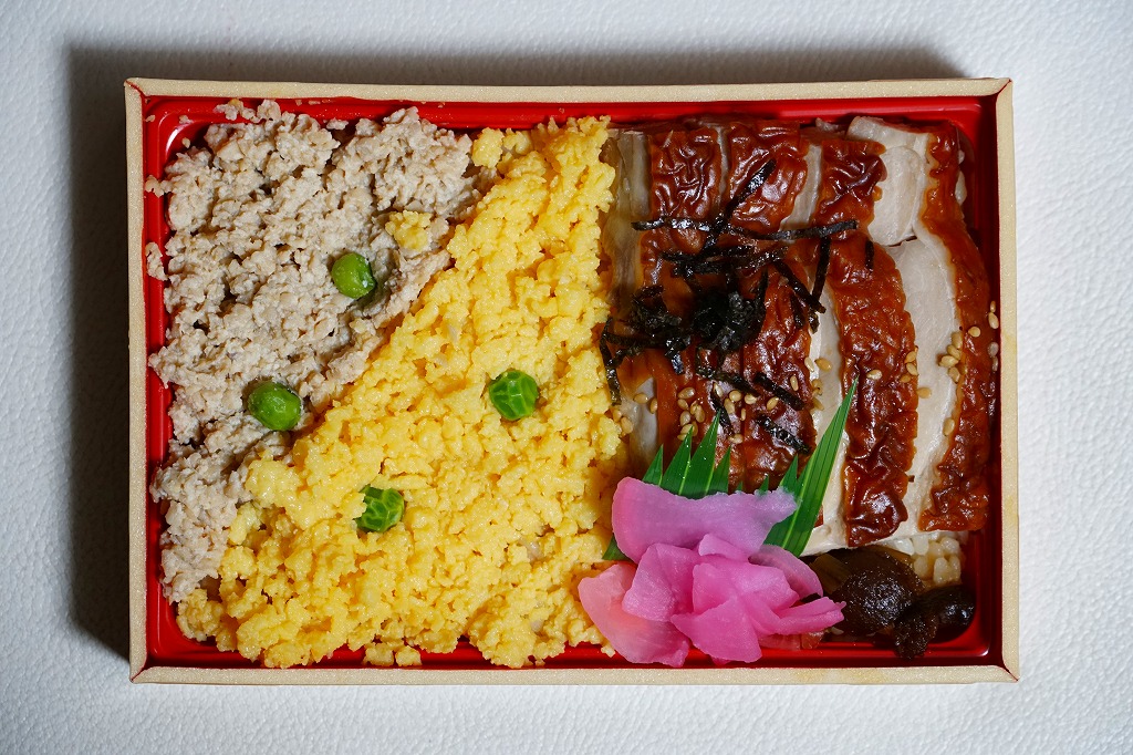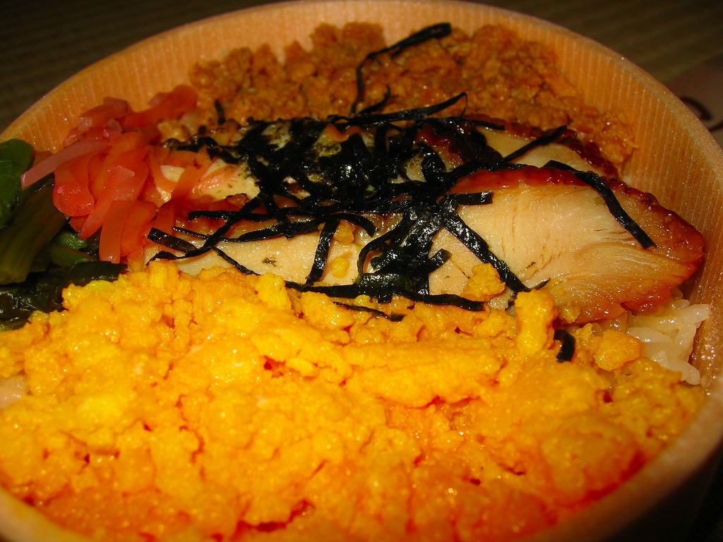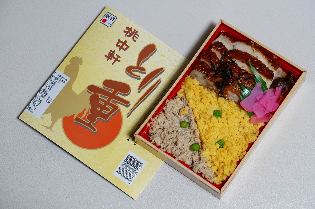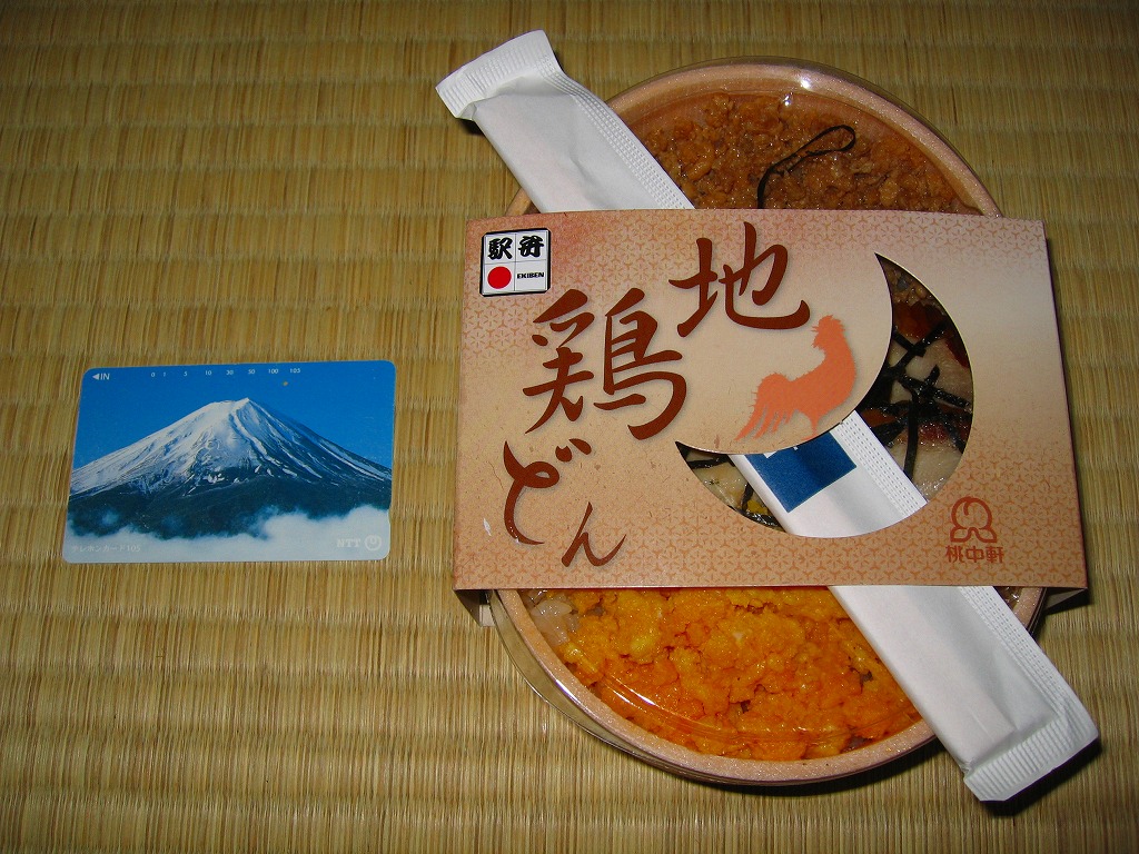 2005(平成17)年の末頃のリニューアル発売か。楕円形の容器に透明なフタをして、三日月型の窓が開くボール紙の枠にはめる。中身は鶏炊込飯の上に鶏そぼろ、鶏照焼、炒り卵を載せて、海苔を振りかけて紅生姜と野沢菜を添える鶏丼。