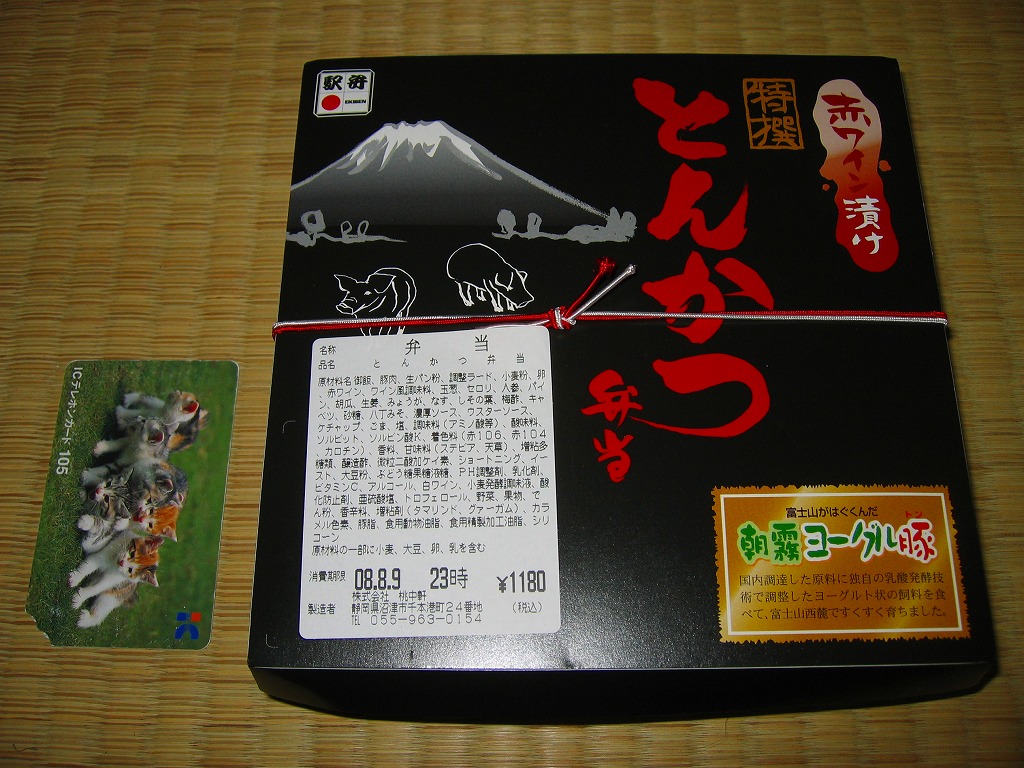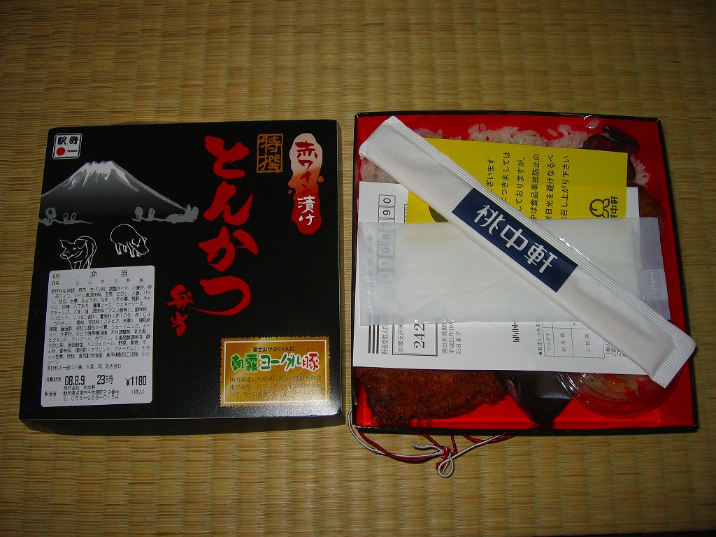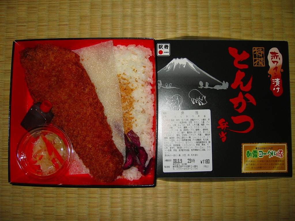 2008(平成20)年1月までに発売か。正方形の黒い専用ボール紙箱に白ゴマ振り白御飯、静岡県富士宮市を中心に飼育されているという朝霧ヨーグル豚(トン)を使用した白身魚フライのような形状をしたトンカツ1本、コールスローと柴漬け、八丁味噌やゴマなどを入れた自家製ソースを詰める、シンプルな内容。