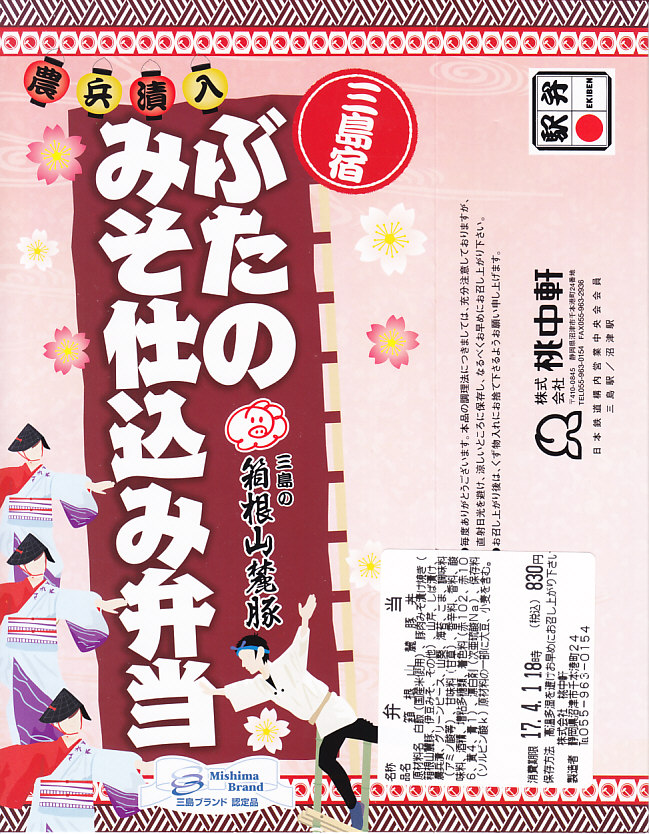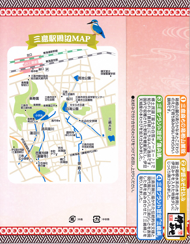 東京駅から新幹線こだま号で1時間弱。三島市は静岡県の東部で伊豆半島の付け根に位置する、人口約11万人の門前町かつ宿場町。東海道が通り三嶋大社が位置する古くからの市街であり、富士の湧水を活かした工業都市でもある。駅弁は沼津駅で明治時代からの駅弁屋が、両駅で同じものを販売。1934(昭和9)年12月1日開業、静岡県三島市一番町。