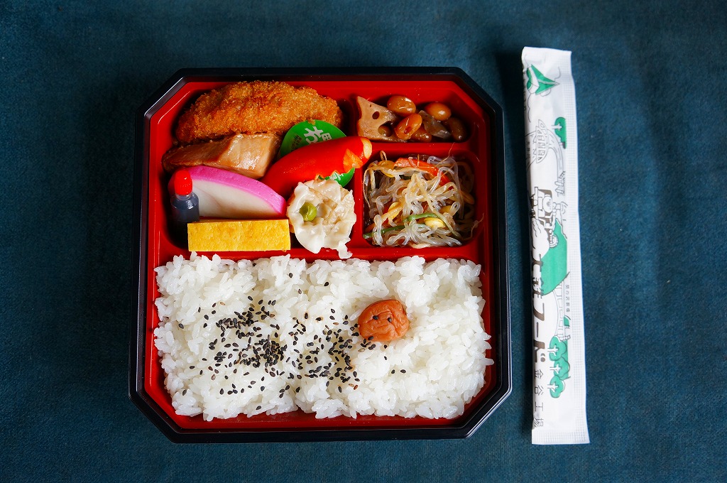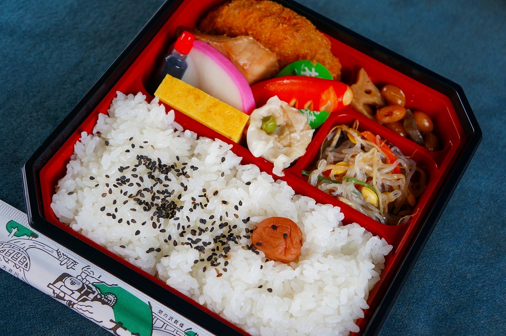 金谷駅の売店で「日替り弁当」の名前で、駅弁とともに販売されていたお弁当。スーパーの惣菜弁当向けなプラ容器に、日の丸御飯、揚げ物、焼売、焼き魚、ウインナー、玉子焼、かまぼこ、わさび漬けカップ、酢の物などを詰めていた。
