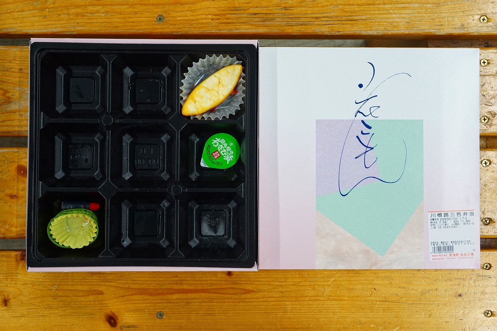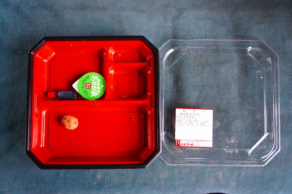 上記の駅弁「川根路三色弁当」の、2017(平成29)年時点での姿。紙箱の絵柄が異なるが、市販の惣菜弁当向け容器であることに変わりない。その構造と中身は同じ。