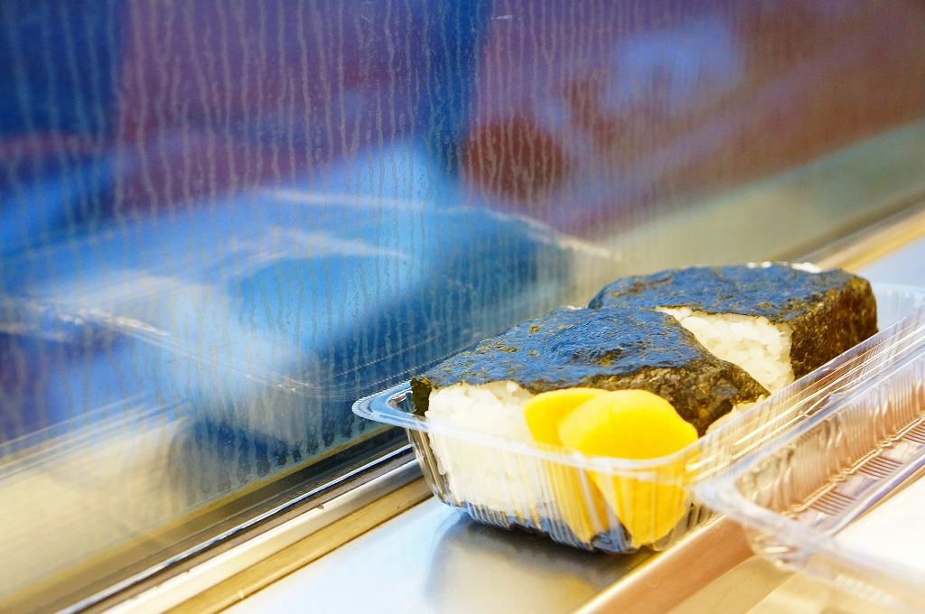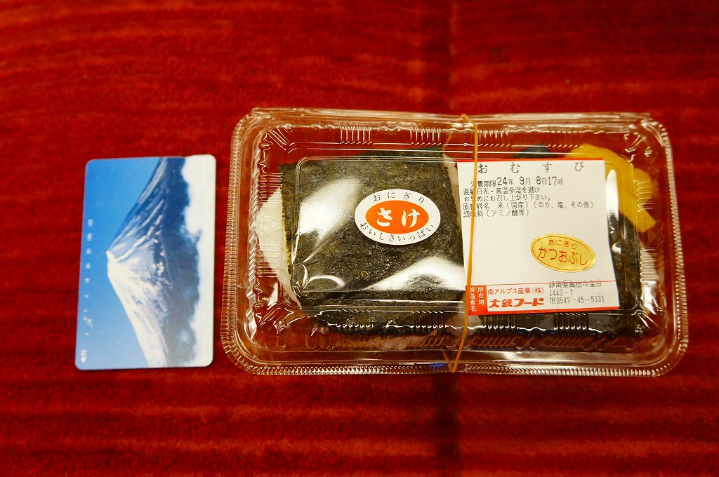 金谷駅の売店で、駅弁とともに販売されていたお惣菜。スーパーの惣菜弁当向けなプラ容器に、おかかのおにぎり、さけのおにぎり、たくあん2切れを詰めていた。これを竹皮に包んで、汽車の時代、明治時代の駅弁を再現!と煽れば、話題と注目を得られるのではないかと思った。