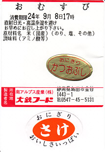 2005(平成17)年7月30日に購入した、金谷駅弁の掛紙。上記の2012年のものと中身も含めて同じだが、食品表示ラベル上の商品名が「SLカゴ弁当」となっているほか、容器はボール紙製でなく竹皮編みであった。
