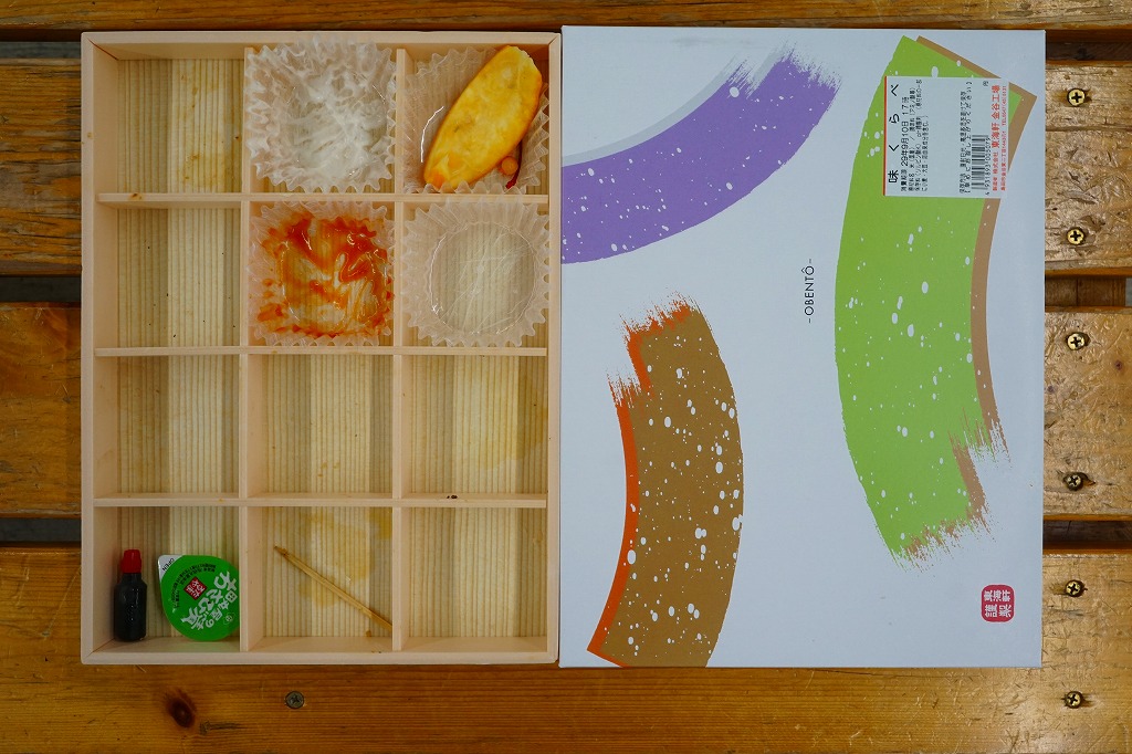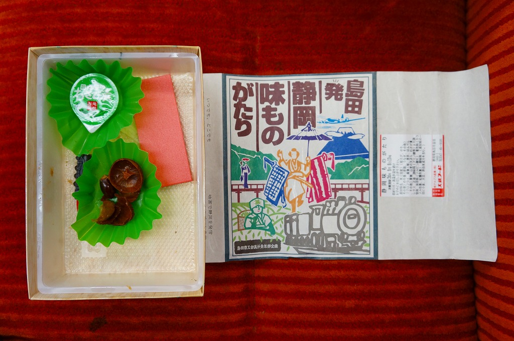 中身はサクラエビを混ぜた御飯の「富士山むすび」、ウナギ蒲焼を刻んで巻いた巻き寿司「うなぎロール」、マグロのメンチカツ、山里の天ぷら、タケノコやサトイモなどの煮物、わさび漬カップ、缶詰みかんなど。宣伝文や解説でうまく見せれば、おしゃれな駅弁になる気がした。2013年までの販売か。