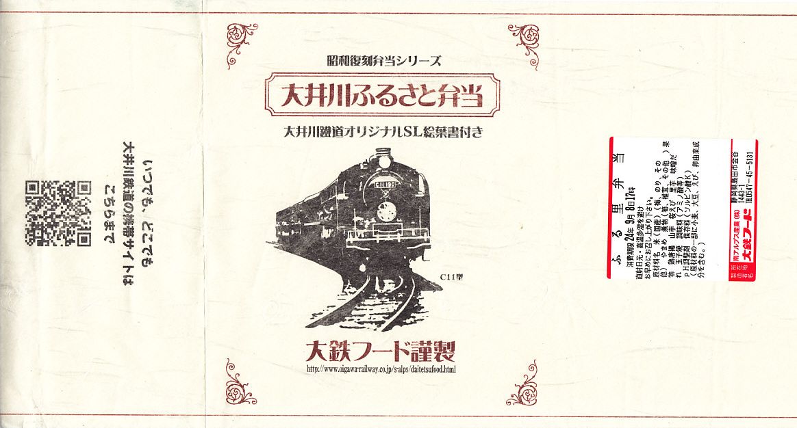 2012(平成24)年9月8日に購入した、金谷駅弁の掛紙。当時の調製元は大井川鐵道の子会社である南アルプス産業「大鉄フード」であった。鉄道会社の経営難で2014(平成26)年2月に弁当部門を静岡駅弁の東海軒へ身売り、「東海軒大鉄フード」の名称を一時的に使い、ほどなく東海軒金谷工場と表記するようになった。価格と調製元の表記を除き、5年後とまったく同じ。