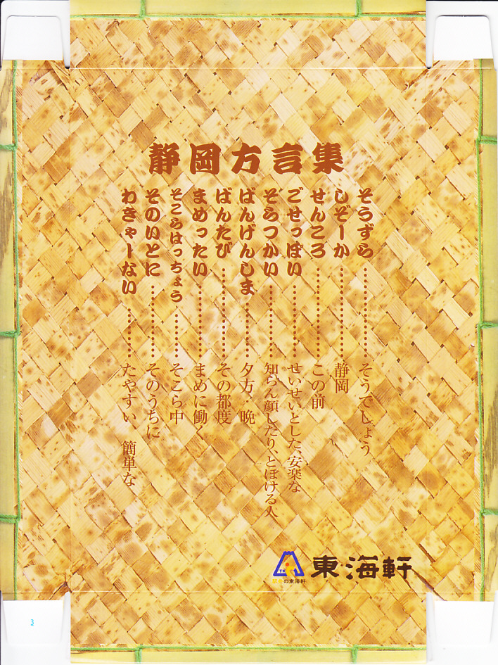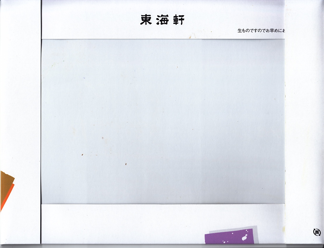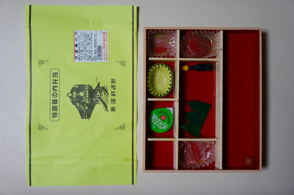 東海軒の仕出し弁当向けボール紙製容器をそのまま使用、12区画に仕切られた中身は、のり、サクラエビ、五目の三色の御飯、マグロ照焼とれんこんとかまぼこ、マカロニサラダ、ナガイモの酢漬け、エビチリ、チャーシューと玉子焼、サトイモやタケノコなどの煮物、鶏肉巻やウインナーなど、黒はんぺん揚げとわさび漬。上の駅弁「川根路三色弁当」の上等版のようなものか、中身の少なからずが共通で、雰囲気もやはり団体向け仕出し弁当という雰囲気。値段を見ると高級な駅弁だが、印象はどうも安っぽい。