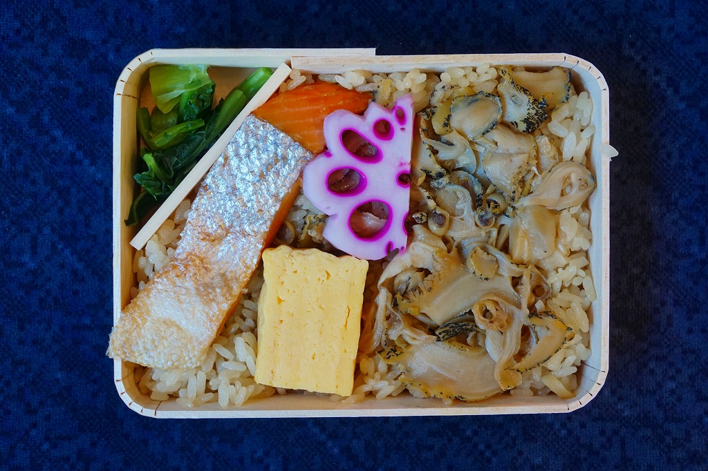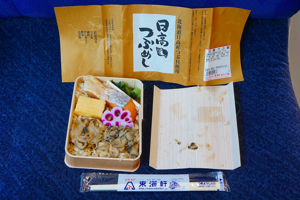 大井川鐵道では2016(平成28)年の秋に発売。ここでは土休日のみの販売。北海道日高産のつぶ貝と日高昆布のだし汁で炊いた御飯につぶ貝を載せ、焼鮭、玉子焼、花れんこん、漬物を添える。つぶ貝の駅弁とは珍しい。貝のクセや歯応えはそれほど強くない、おとなしい貝飯。鮭がうまかった。価格は2017年の購入時で980円、2022年4月から1,000円。