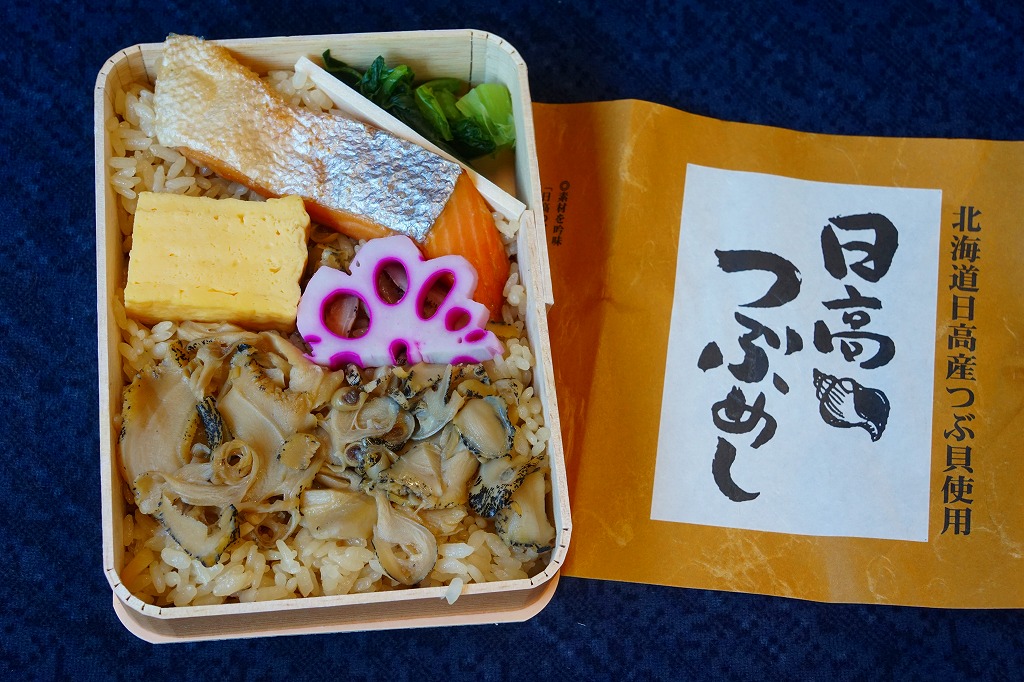 2001(平成13)年に当時の北海道日高支庁が日高オリジナル弁当コンテストを実施、9月から道の駅で販売したグランプリ作品「日高つぶめし」は連日完売の人気となり、翌2002(平成14)年には日高本線の静内駅でも販売、2005(平成17)年には京王百貨店の駅弁大会で実演販売もされた。調製元のホテルが2013(平成25)年に破産して終売したが、このホテルの経営を引き継いだ会社が翌2014(平成26)年に、この弁当の販売を復活させた。