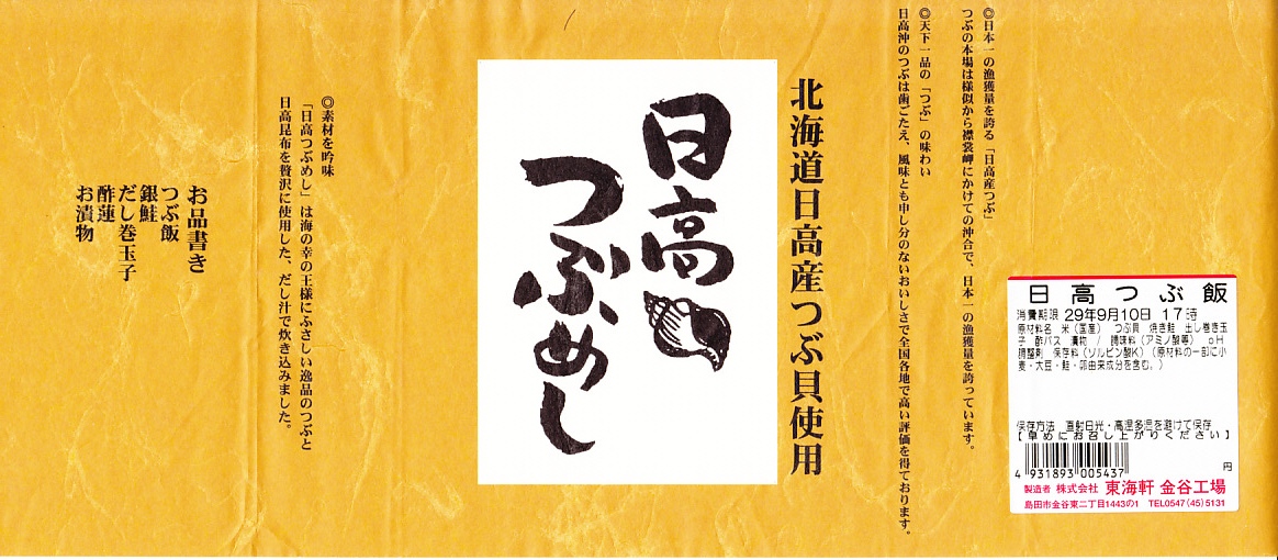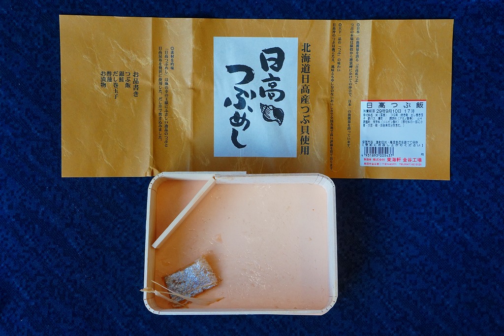 その北海道の日高つぶめしの調製元と、大井川鐵道の親会社は、同じ会社。公式な発表はないが、北海道日高の弁当と同じようなものが大井川鐵道で売られるのは、これが縁なのではないかと考えている。こちらの調製元は大鉄フード改め東海軒大鉄フード改め東海軒金谷工場で、さすがにツブ貝の量は北海道の半分ほど。