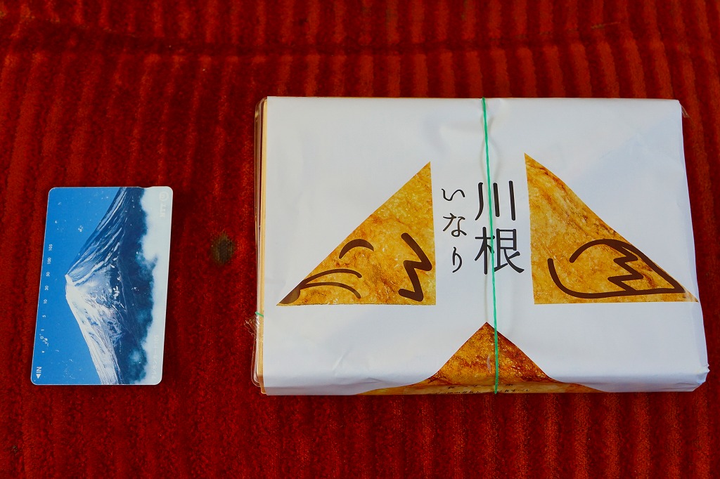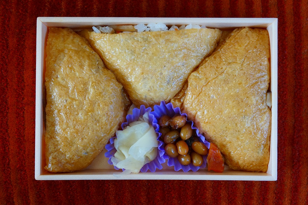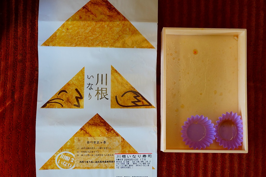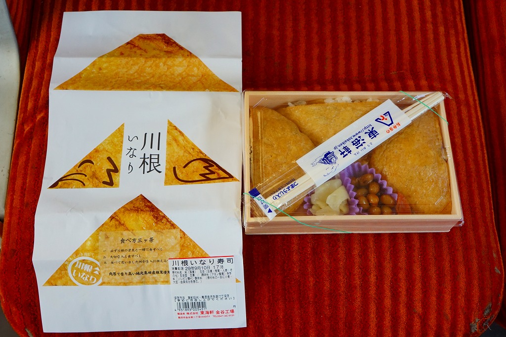 川根いなりとは、2010(平成22)年から静岡県島田市川根町、大井川鐵道の駅でいうと家山駅や抜里(ぬくり)駅のあたりで、地域ぐるみで取り組まれているプロジェクト。2011(平成23)年1月に地域で結成された「川根いなりで包んであげ隊」では、川根いなりのルールを「形は三角形で川根を囲む山々を表すべし」「加盟店が思う“川根らしさ”を1個だけ取り入れるべし」「川根茶とともに振る舞うべし」で、食べ方の提案を「必ず川根の空気も一緒におなかに入れながら食すべし」「大切な人と食すべし」「食べて思いだした何か、を人に伝えるべし」と定義、後者がこの駅弁の掛紙にも記される。ネット上では2012年以降は表だった活動が見えないが、川根温泉の食堂で提供されたり、こうやって駅弁のようなものになったりしている。この駅弁は、2022年からは売られていないかもしれない。